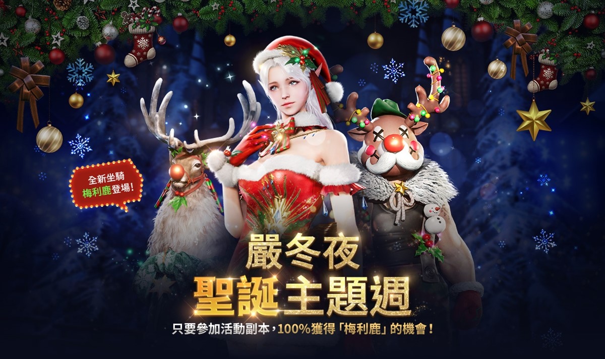 12/17 維護後 ~ 12/31 維護前,活動期間內,開啟「嚴冬夜樹廣場」單人限時挑戰狩獵副本,狩獵怪物可獲得各種獎勵;擊倒最終首領「大師聖誕老人」後,可 100% 獲得「大師聖誕老人禮物箱(活動)」,開啟後可獲得包含「魯道夫銅幣(活動)」等豐厚獎勵。將「魯道夫銅幣(活動)」帶去給活動NPC「聖誕蕾亞」,可購得全新稀有聖誕坐騎「梅利鹿」以及過往聖誕活動壺精們。