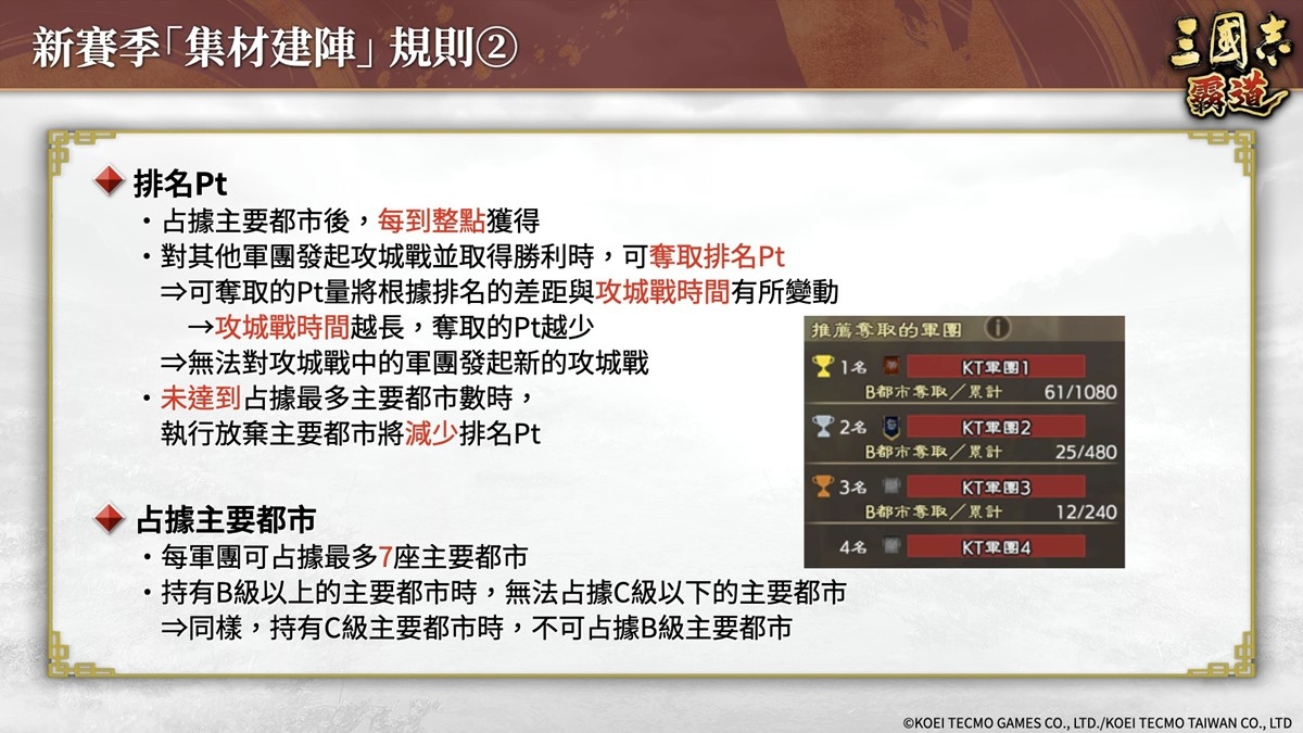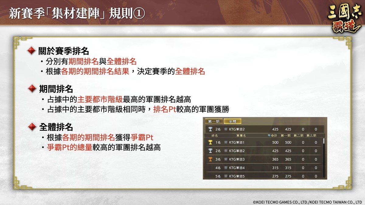 排名將以軍團為單位進行計算,分為各季排名和整體排名。各季排名將依照占據主要都市的最高階級,以及排名 Pt 進行排序。整體排名將依照各季排名可獲得的爭霸 Pt 的總和進行排序。