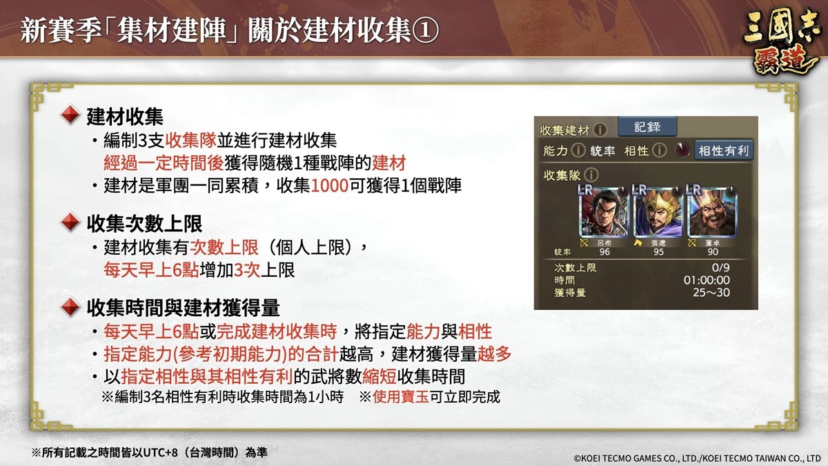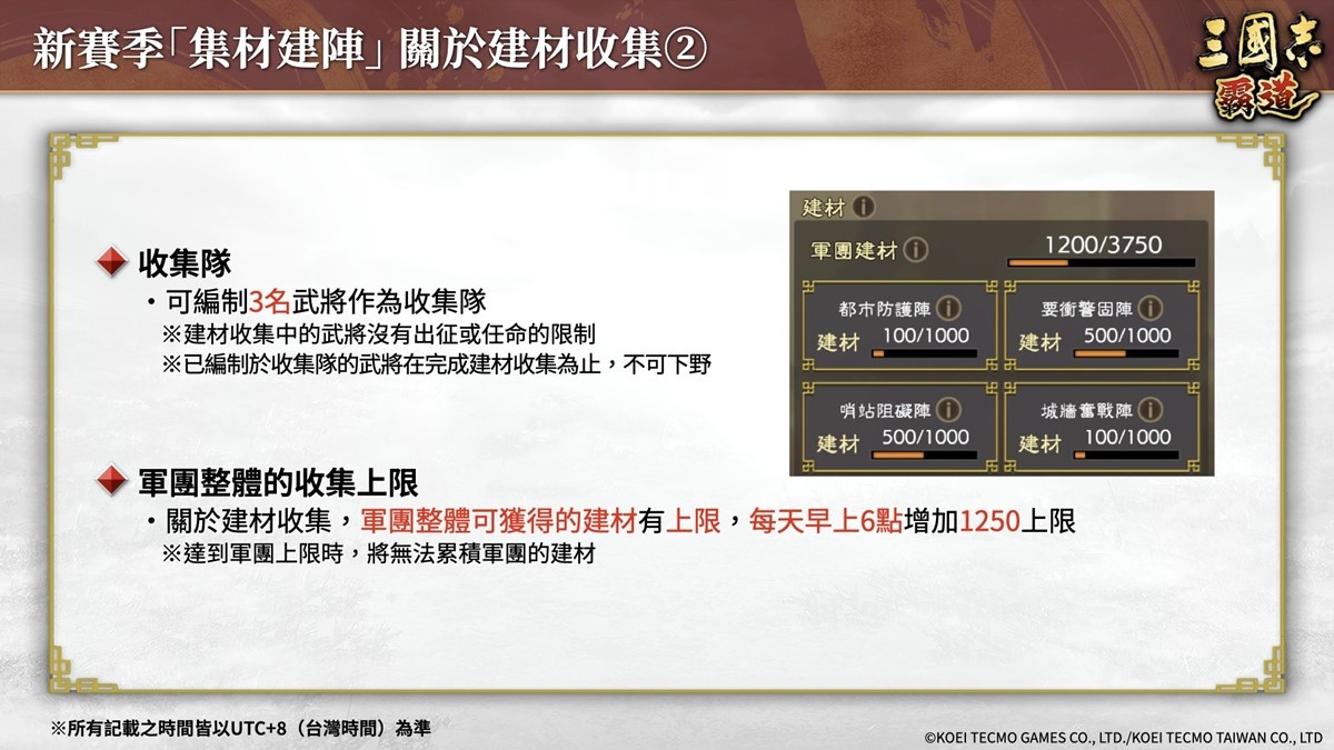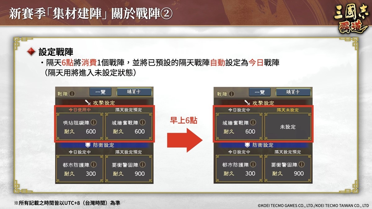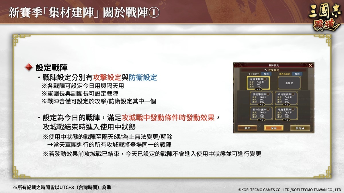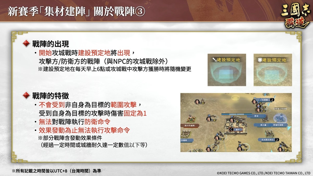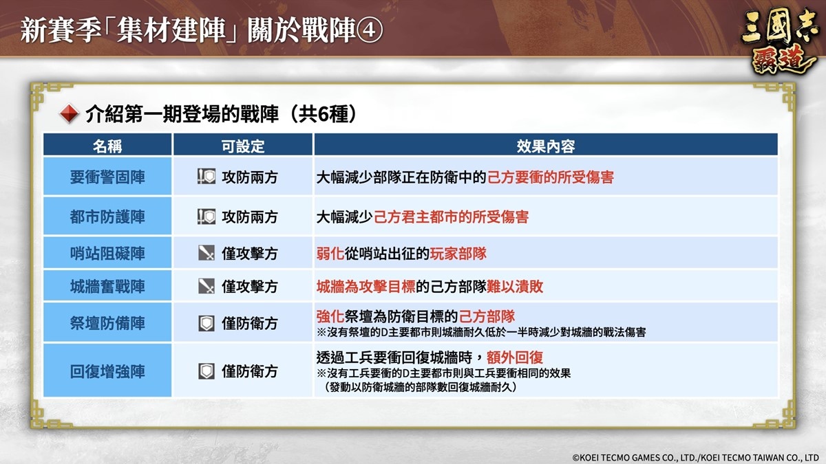 玩家可以在攻城戰使用能發揮特殊效果的建築物「戰陣」。使用戰陣需要該戰陣的「建材」,可藉由軍團成員派出 3 名武將收集建材。戰陣擁有可以改變戰況的強力效果,第一季將推出「削弱敵方哨站部隊」、「減輕己方主城所受傷害」等共 6 種戰陣。