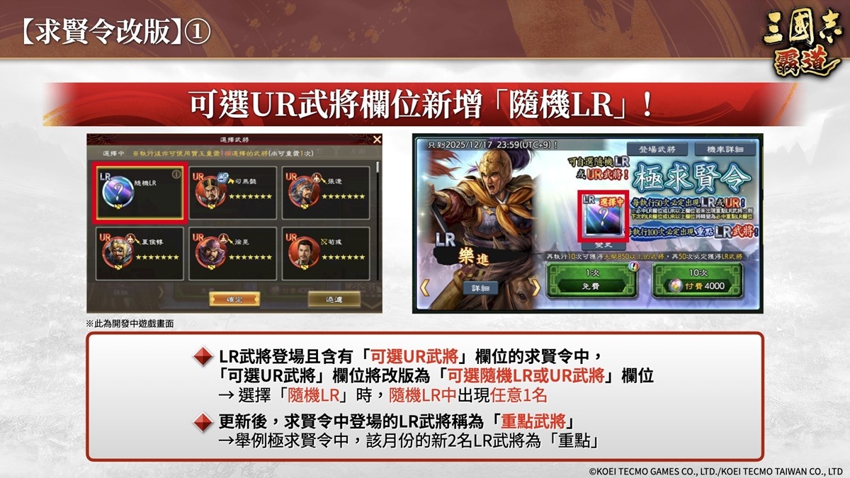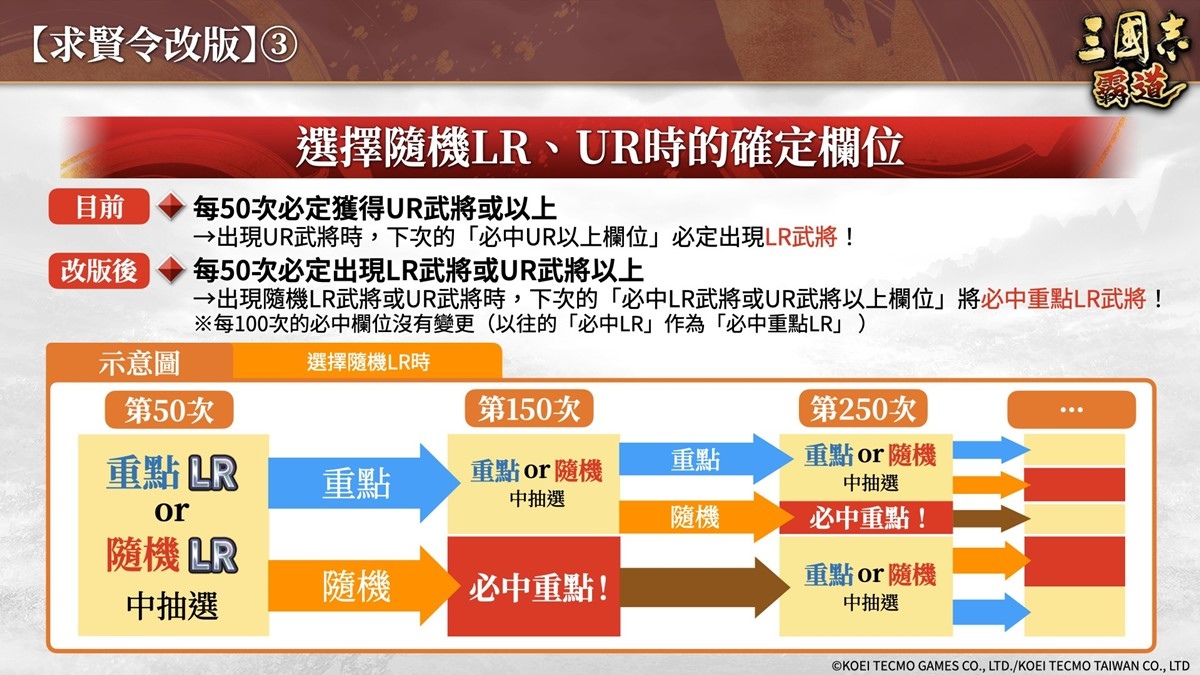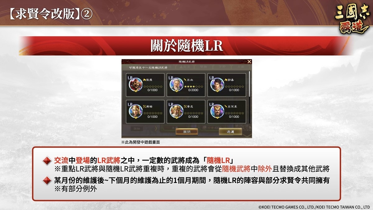 另外,本次更新也修改了極求賢令等「以LR武將為主,但也可選擇UR武將」類型的求才。具體修改的內容為,過往只能選擇 UR武將的欄位,修改為能選擇從「部分於交流中登場的LR武將隨機出現」。將更容易獲得過去的 LR,並且能更方便地強化整體部隊。
