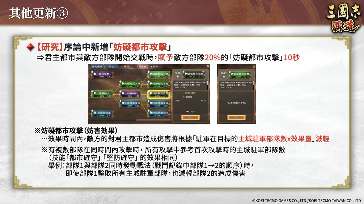 最後,研究的序論中新增「妨礙都市攻擊」。透過此效果在開始交戰起一定時間,依駐軍主城的駐軍部隊數大幅提升主城的耐久力。