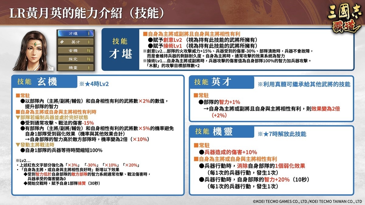 「LR黃月英」為智力型步兵武將,當兵器在完好狀態下可強化戰法與技能,還能賦予新有利變化「操賢」,提升兵器速度和兵器攻擊威力。