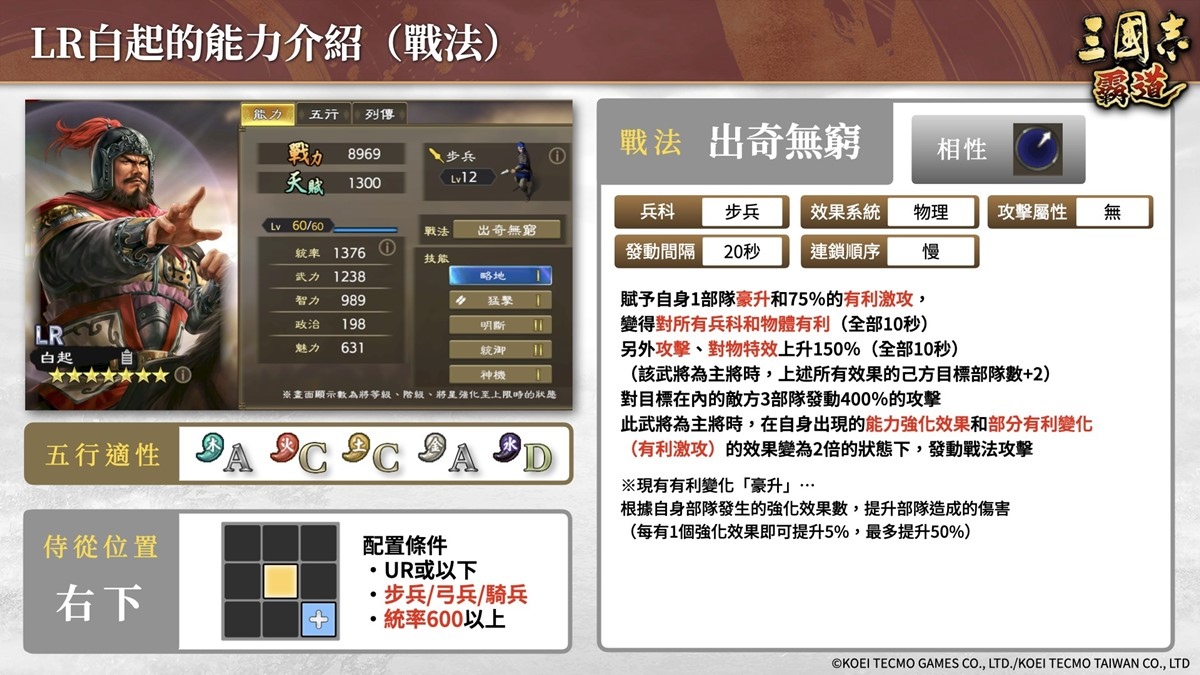「LR白起」為物理型步兵武將,可賦予提升火力的有利變化「豪升」和「有利激攻」,並以「能力強化效果變為2倍後進行攻擊」的戰法攻擊,可展現出極高對物火力。