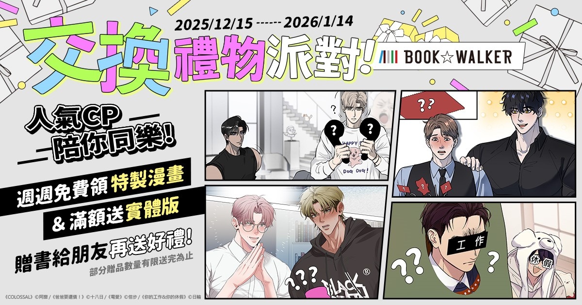 電子書平台 BOOK☆WALKER「交換禮物派對」活動現正盛大推出!即日起至 2026 年 1 月 14 日,平台特別邀請四位台灣 BL 漫畫家——十八日、日輪、阿糜、信步聯合創作。讀者前往活動頁即可與《爸爸要還債!》、《你的工作&你的休假》、《COLOSSAL》、《電愛》等人氣角色一同參與派對,每週一則獨家限定漫畫特典免費蒐集!