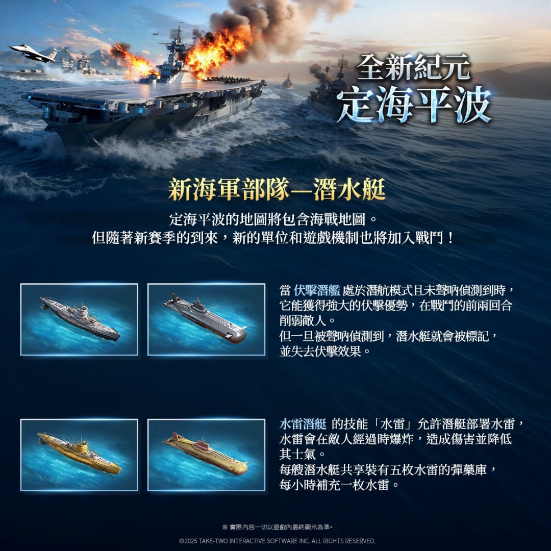 本賽季登場的「航空母艦」與「潛艦」將徹底改變海戰生態,海權爭奪將成為制勝關鍵:航空母艦作為海上移動堡壘,能搭載盟友的空軍單位進行長距離移動,大幅減少士氣損耗,讓空中單位具備更優秀的續航與作戰能力。潛艦則扮演戰場上的隱匿殺手,能無聲無息地從敵陣後方發動突襲,是徹底擊潰敵方防線與守軍的戰術利器。
