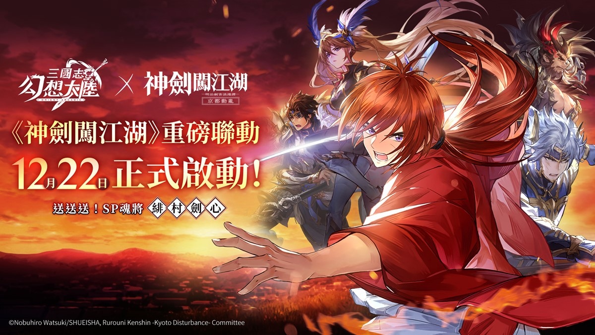 卡牌 RPG《三國志幻想大陸》與 TV 動畫《神劍闖江湖-明治劍客浪漫譚-京都動亂》聯動合作,於 12 月 22 日正式上線!活動期間送聯動武將「緋村劍心」,傳說級劍客強勢參戰!