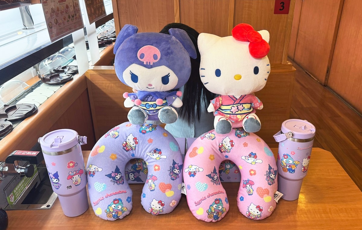 第二波 1 月 9 日起推出「兩用玩偶頸枕」有 Hello Kitty 與酷洛米兩款,收納後能變成可愛玩偶擺飾,展開後則是柔軟支撐的舒適頸枕,布面更印上穿著和服的角色插畫,只要加購 499 元就可以將萌力治癒小物帶回家。