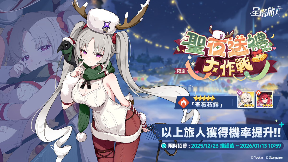 此次版本更新後,首位限定 5 星旅人「聖夜菈露」正式亮相,更多全新玩法和優化內容頁同步上線,參與相關活動,可以獲得招募禮券、大量養成材料等豐厚獎勵,希望這份來自雪願節的獨家回憶能為這個冬日增添溫暖色彩!