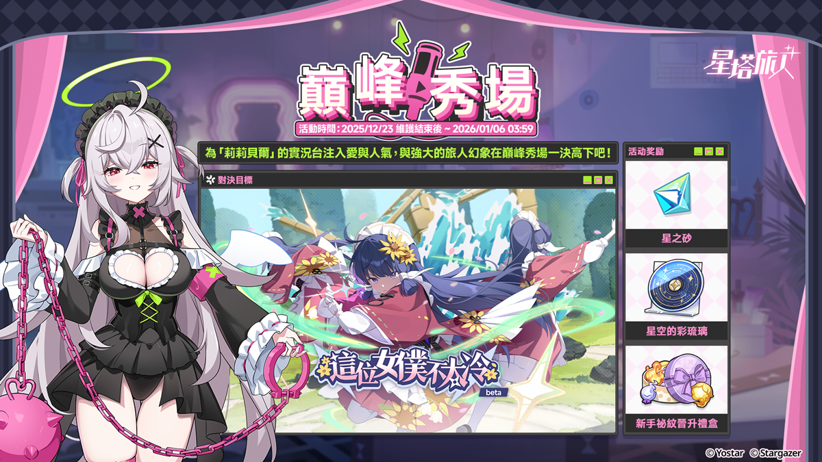 全新玩法「巔峰秀場Beta」也將於 12 月 23 日同步開放,歡迎魔王大人前來為「莉莉貝爾」的實況台注入愛與人氣,與強大的旅人幻象在巔峰秀場一決高下!