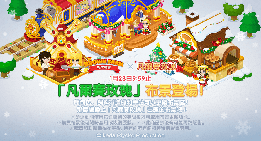 可改變農場建築物外觀的「凡爾賽玫瑰」布景來囉!本次將推出麵包店、飼料製造機與車站的特殊布景,限時登場的布景須達到能使用該商店的等級才可啟用,布景取得之後可以永久使用,也能隨時更換或恢復成原狀,快來幫農場換上「凡爾賽玫瑰」主題的布景吧。