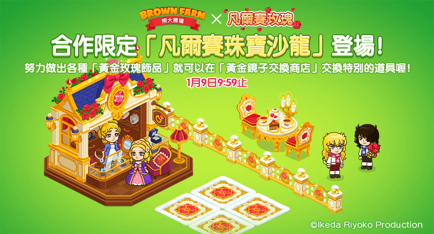 「凡爾賽珠寶沙龍」期間限定登場!只要製作出黃金玫瑰飾品就可以到「黃金鏡子交換商店」來兌換特別的合作道具。把「凡爾賽玫瑰」小夥伴設置在欄位中,還能夠讓小夥伴使用能力來幫忙生產,農友們一起來蒐集超可愛的小夥伴與裝飾吧!