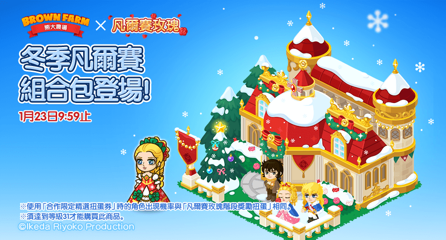 這次合作活動推出了特別組合包,內含「聖誕安東妮德」小夥伴和「冬季凡爾賽宮殿」熊大的家房屋外觀,另外還包括一張「合作限定精選扭蛋券」,在活動期間使用此扭蛋券時,小夥伴的登場機率與「凡爾賽玫瑰」階段獎勵扭蛋相同,每人限購1組,千萬別錯過!