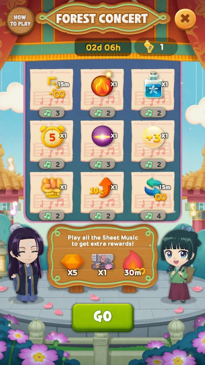 在活動期間內,只要通過一般新關卡即可獲得「樂器(豎琴)」,使用獲得的樂器即可挑戰取得樂譜中的道具,成功挑戰後便可以獲得相對應的活動獎勵喔!