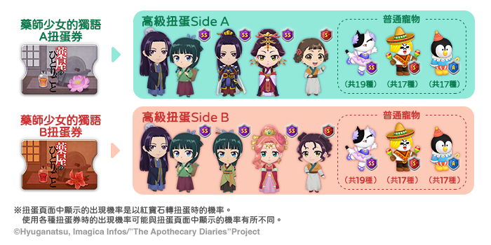 本次合作活動期間內「貓貓&壬氏」、「貓貓」、「壬氏」、「玉葉」、「樓蘭」、「小蘭」和「子翠」都將化身為「合作活動限定寵物」(※)在高級扭蛋中登場!透過達成遊戲中各種合作活動任務獲得的「藥師少女的獨語」扭蛋券可用來轉高級扭蛋!獲得獎勵的條件等詳細資訊,請至遊戲內公告確認。快把握機會讓動畫「藥師少女的獨語」的角色們成為你的過關夥伴,一起在遊戲中闖關吧!