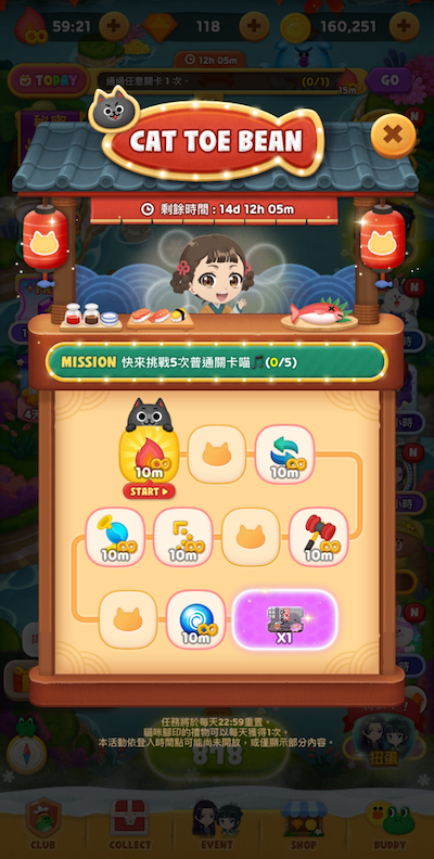 在活動期間內,以賓果遊戲方式,點選覆蓋的卡片進入活動關卡,把卡片全部翻開後即通關,通過所有關卡即可獲得獎勵!翻到幸運卡片時,也可以在過關後獲得幸運卡片獎勵,若翻開的卡片是超級幸運卡片,不用挑戰該關卡即可直接過關!