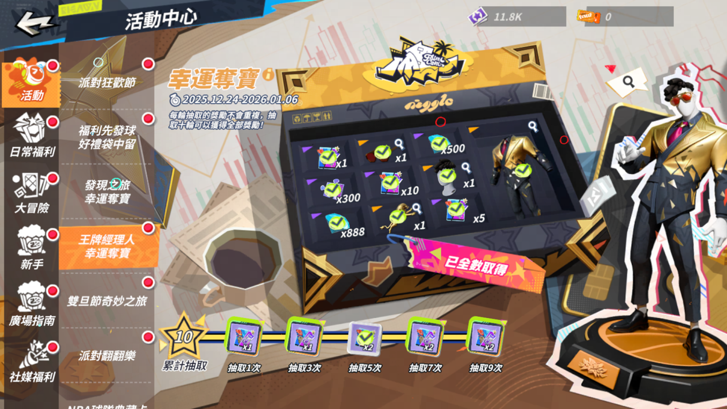 經典玩法「世界巡迴賽」回到快艇,在挑戰中奪取專屬驚喜。此外,「NBA 球隊典藏卡 25-26」也亮相,取得該球隊的典藏卡即獲得對應球隊的專屬入場背景,並隨著 NBA 賽季進行而有不同的變化。幸運奪寶則迎來高級時裝「王牌經理人」,完成十輪抽取即可獲得全部獎勵。