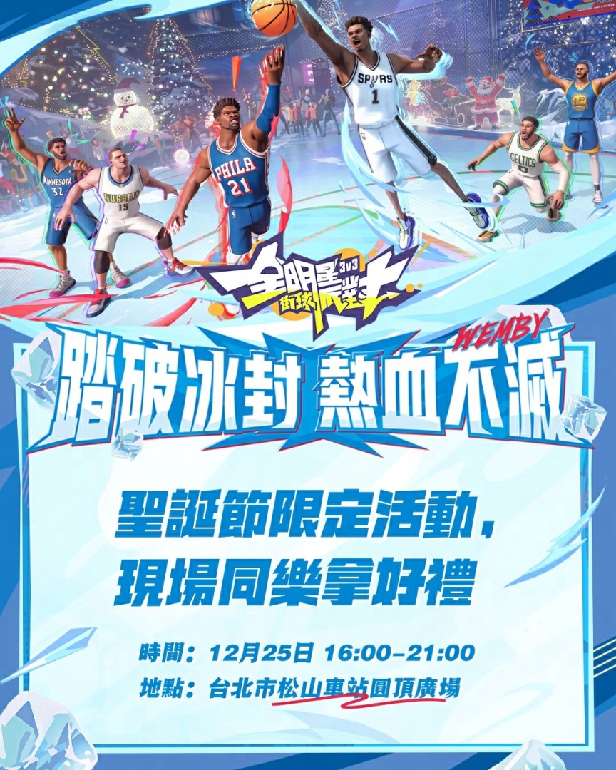 跟著新球星登場!《全明星街球派對》也將於 12 月 25 日以「踏破冰封,熱血不滅」為主題,舉辦聖誕線下同樂派對要與大家一起過聖誕啦!在寒冷的冬天裡,我們也要像文班亞馬一樣無所畏懼,破冰出擊!現場準備了許多闖關活動,只要街球手完成任務、通過關卡就可以參加抽獎,還有限定周邊小禮物等你來拿!最大獎還有機會奪得 iPhone 17 唷!