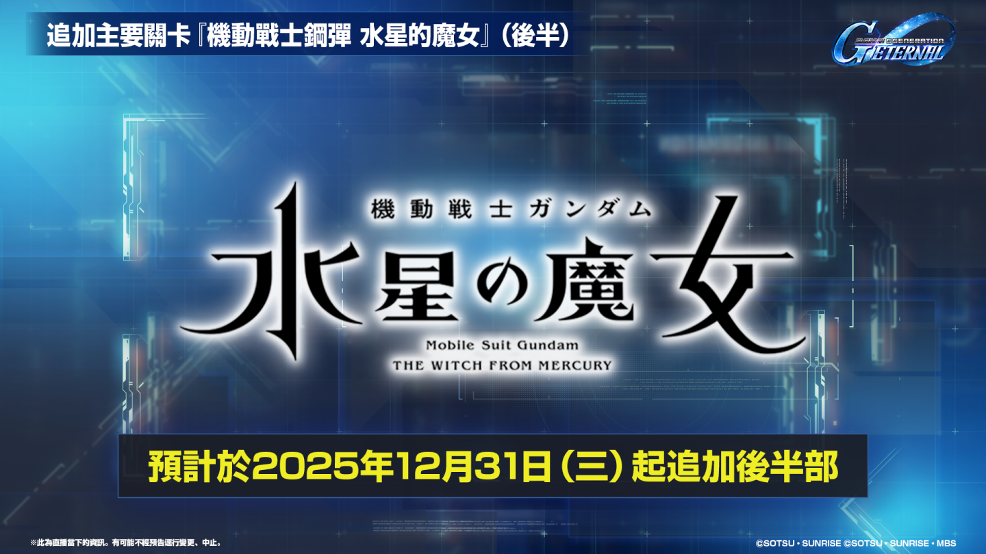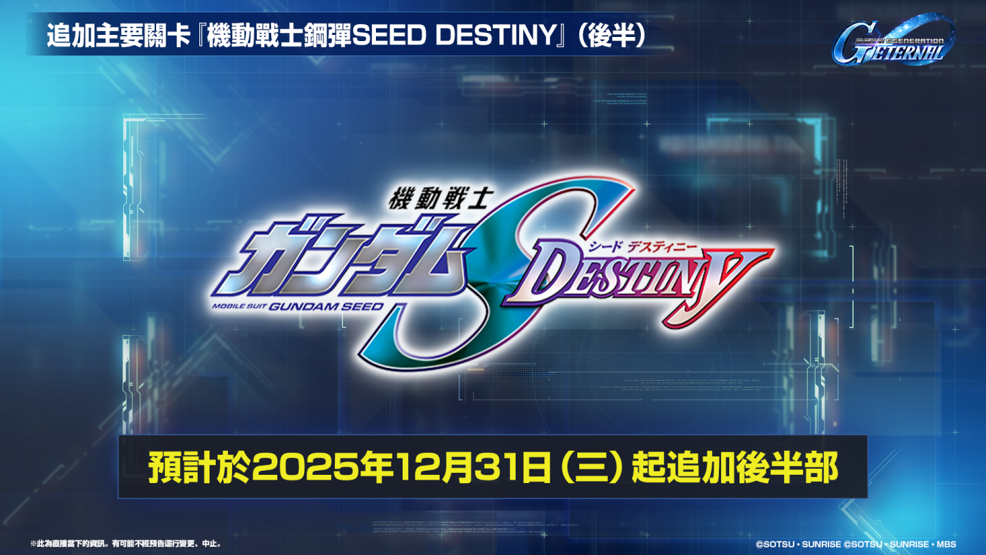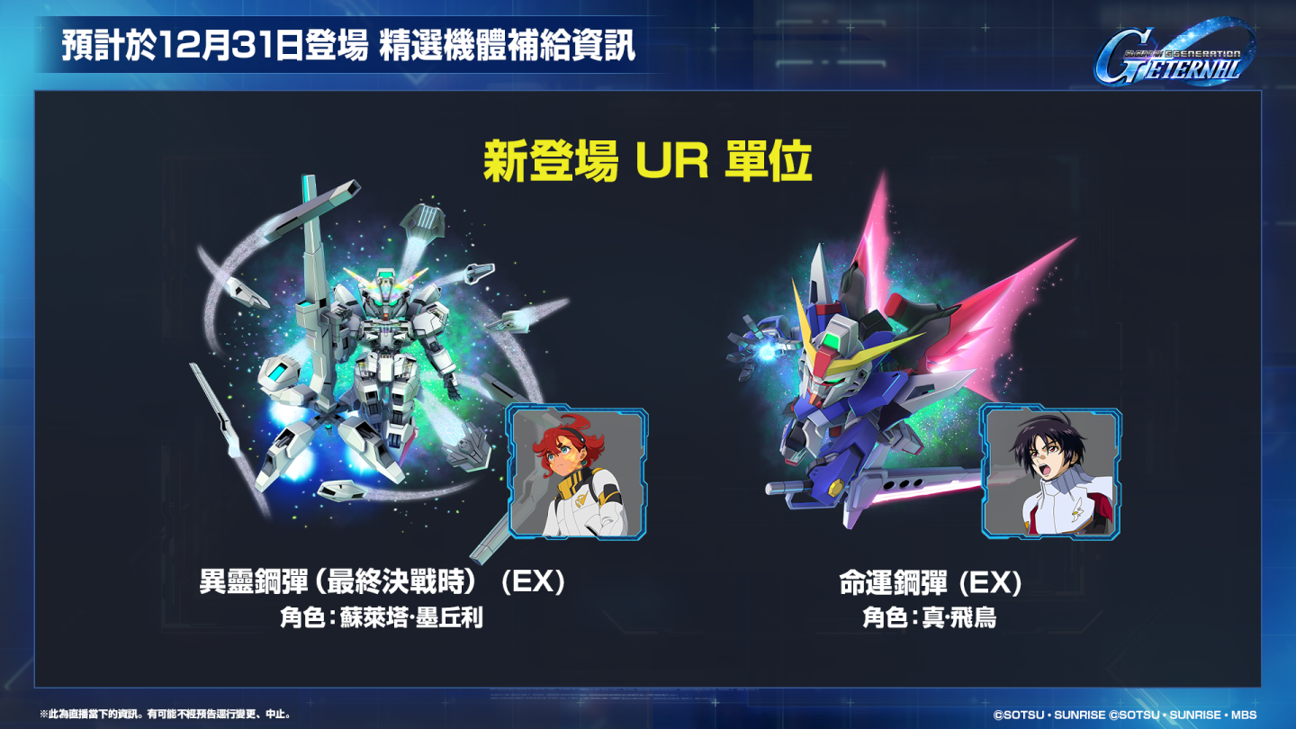 12 月 31 日將進行大規模內容更新。主要關卡將追加《機動戰士鋼彈SEED DESTINY》與《機動戰士鋼彈 水星的魔女》後半段劇情,同步開放「攻擊自由鋼彈」與「異靈鋼彈」之開發路線。精選補給方面,將限時推出 UR「異靈鋼彈(最終決戰時)(EX)」配搭角色蘇萊塔‧墨丘利,以及 UR「命運鋼彈(EX)」配搭角色真‧飛鳥。此外,UR「攻擊自由鋼彈(EX)」與角色煌‧大和將進行復刻。