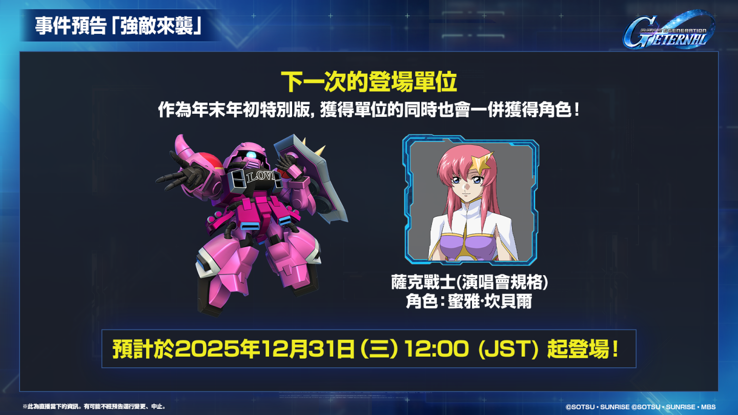 針對歲末年初,營運方推出特別企劃,包含「強敵來襲」事件,玩家擊敗「薩克戰士(演唱會規格)」可獲得 SSR 單位及角色蜜雅‧坎貝爾。福利活動部分則提供免費 10 連機體補給,玩家可重複抽取並選擇保留結果,保證獲得 1 架 UR 單位。