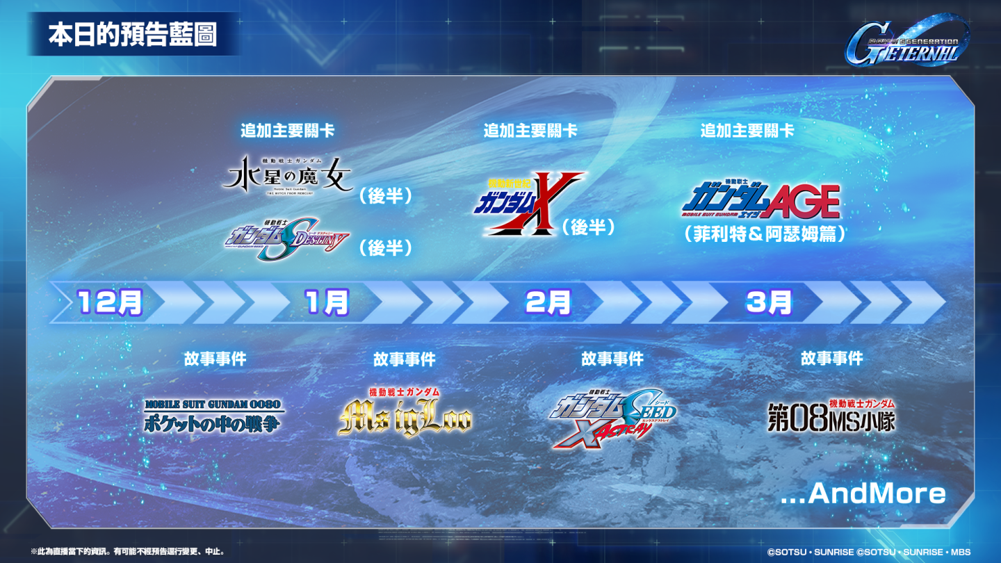 2026 年 1 月起將陸續實裝「機動戰士鋼彈 MS IGLOO」、「機動新世紀鋼彈X」(後半)、「機動戰士鋼彈SEED X ASTRAY」及「機動戰士鋼彈AGE」(菲利特&阿瑟姆篇)等關卡與事件。系統功能將新增單位 SSP 化與「來自教官的考驗」要素,原故事事件「0083」及「鐵血孤兒 月鋼」則轉為常駐的「歷史關卡」。