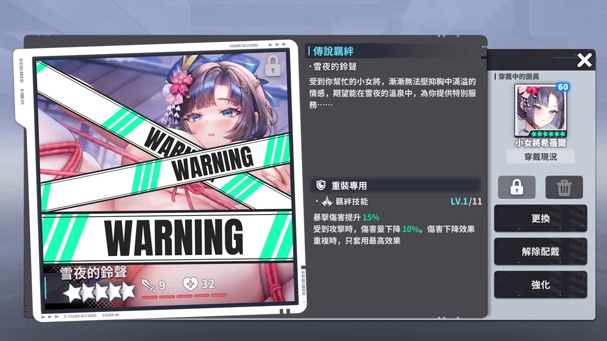 受到你幫忙的小女將,漸漸無法壓抑胸中滿溢的情感,期望能在雪夜的溫泉中,為你提供特別服務……