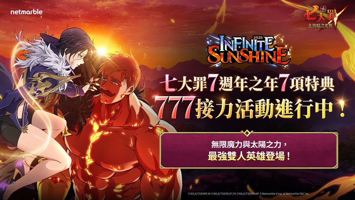 網石集團 Netmarble Corporation 宣布,為《七大罪:光與暗之交戰》推出「2026 NEW YEAR FESTIVAL: INFINITE SUNSHINE」。本次更新推出全新的 UR 雙人英雄、嶄新的季節性內容,並展開了名為「777 接力活動」的長期週年紀念計畫。遊戲以增量的獎勵、特別的召喚機會以及全新的故事體驗,為所有遊戲所支援地區的玩家揭開新年序幕。