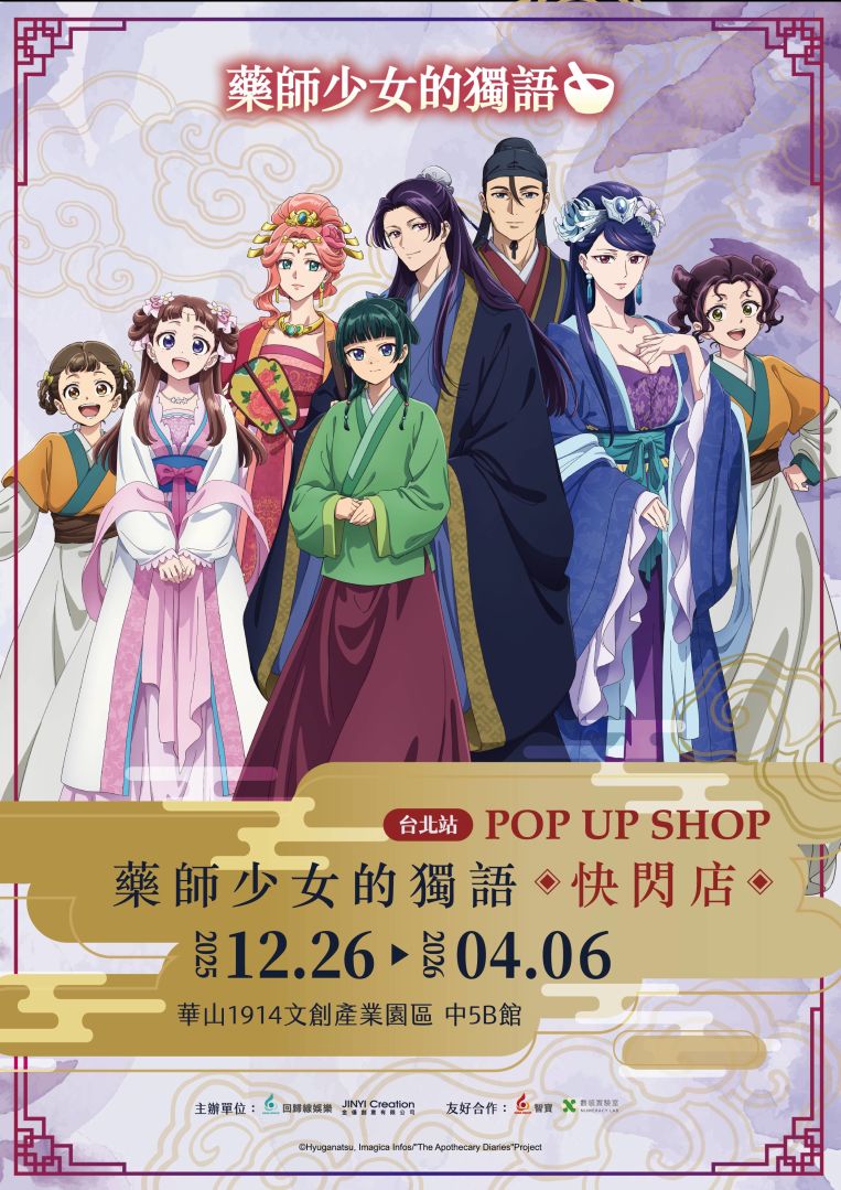 在高雄駁二首站創下話題高峰、吸引破萬名粉絲朝聖的《藥師少女的獨語》POP-UP SHOP,於 2025 年 12 月 26 日正式移師台北華山 1914 文創園區。台北站將推出宮廷沉浸式展區與多款全新首賣周邊商品,一路展出至 2026 年 4 月 6 日。