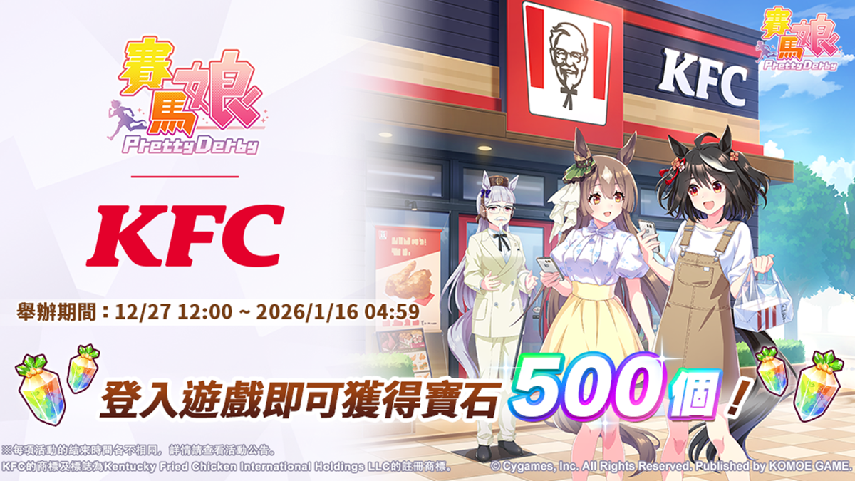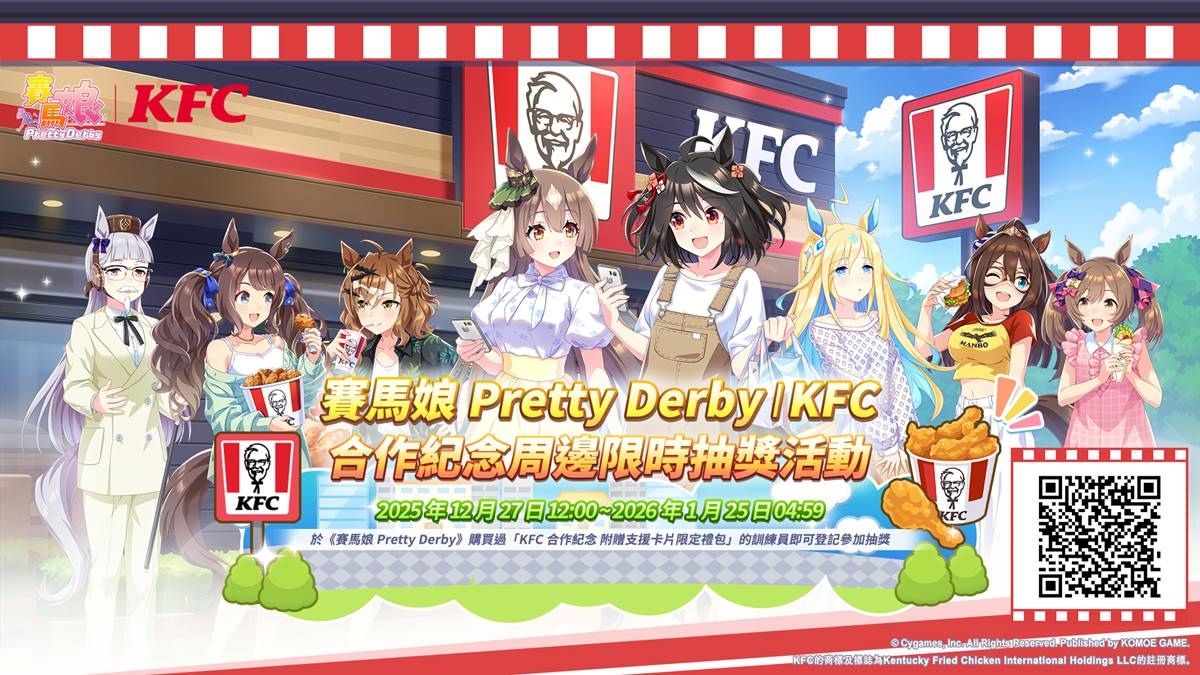 《賽馬娘Pretty Derby》繁體中文版於 12 月 27 日 12:00 舉辦「賽馬娘Pretty Derby | KFC」合作活動!同時販售「KFC合作紀念 附贈支援卡片限定禮包」,購買禮包可獲得合作限定支援卡片與道具,並可參與抽獎活動,有機會將「KFC 合作紀念周邊」帶回家!