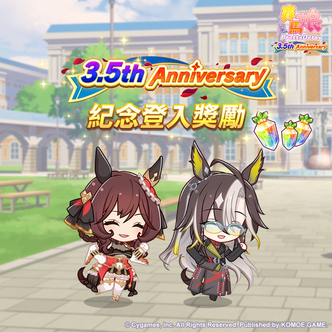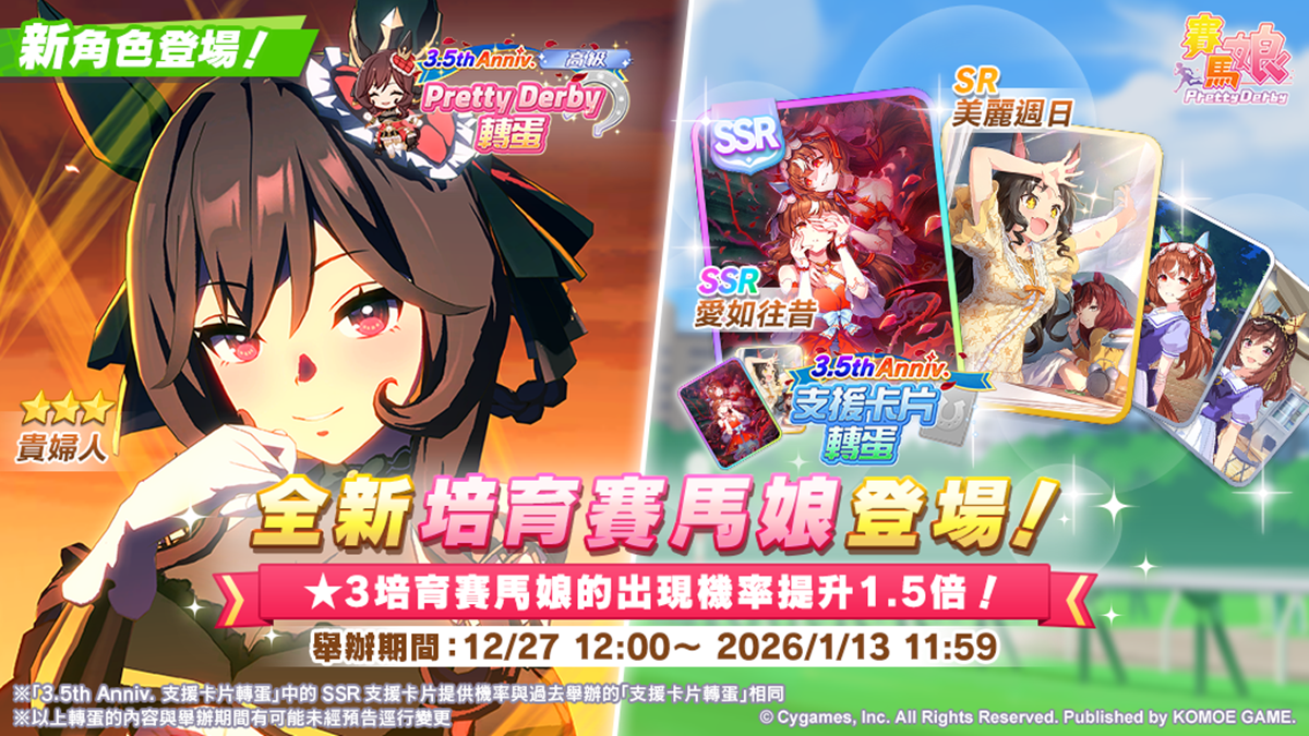 由日本 Cygames 開發、小萌科技代理的養成手機遊戲《賽馬娘Pretty Derby》繁體中文版已於 12 月 27 日正式營運 3.5 週年並開始週年紀念活動,推出全新★3特選培育賽馬娘【Regina dei fiori】貴婦人,以及全新 SSR 支援卡片【Devilish Whispers】愛如往昔、SR 支援卡片【帶給大家最棒的美麗☆】美麗週日。