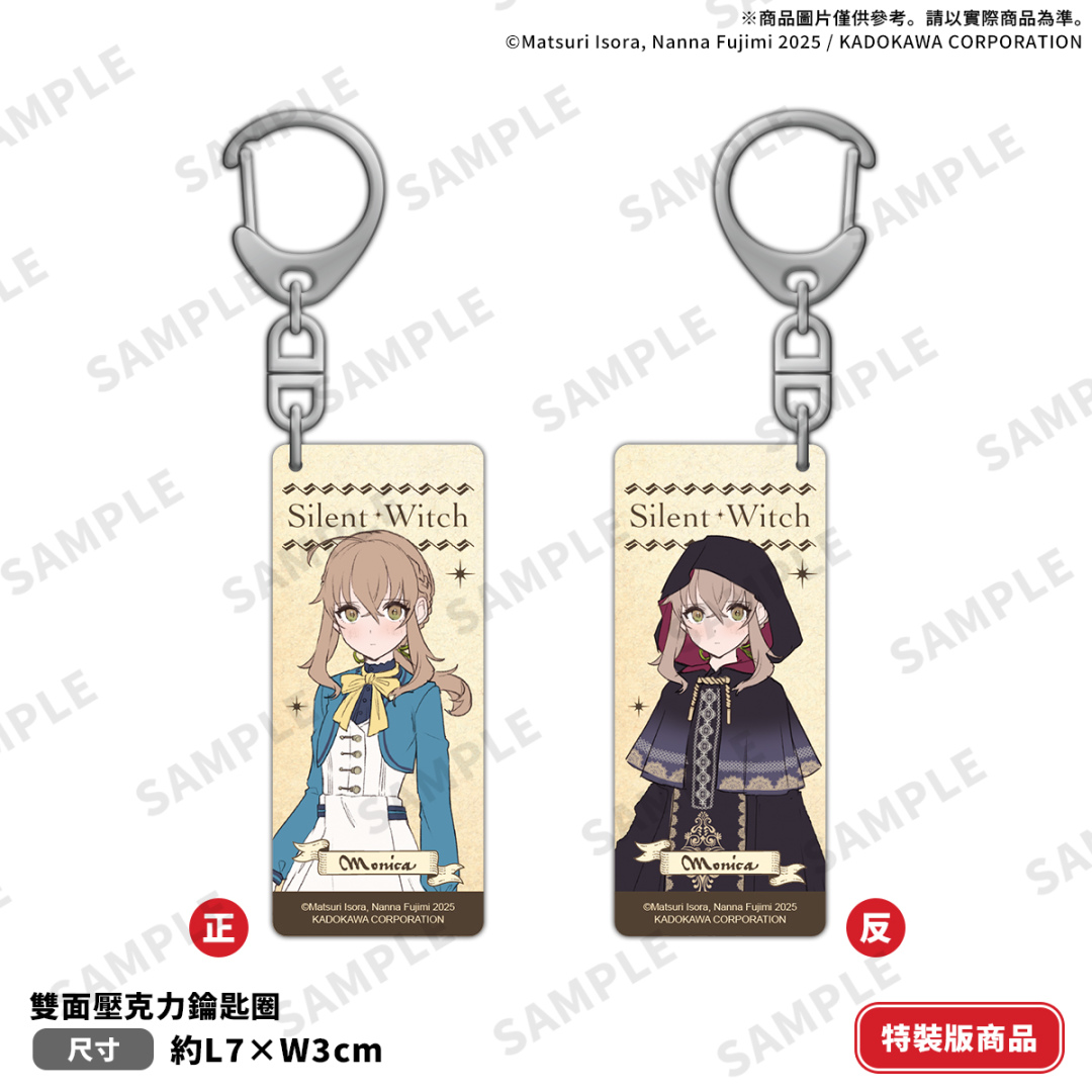 《Silent Witch Ⅸ -extra- 沉默魔女的短篇集》特裝版收錄限定特典──以莫妮卡學園風與沉默魔女裝扮兩種造型呈現角色魅力的「雙面壓克力鑰匙圈」;與書封同款再現莫妮卡擁抱最愛書物模樣的「組合壓克力立牌」及「本集小說with特別設計書衣」皆收錄於「特裝版珍藏書盒」,請讀者朋友把握事前限期預購機會以免向隅。