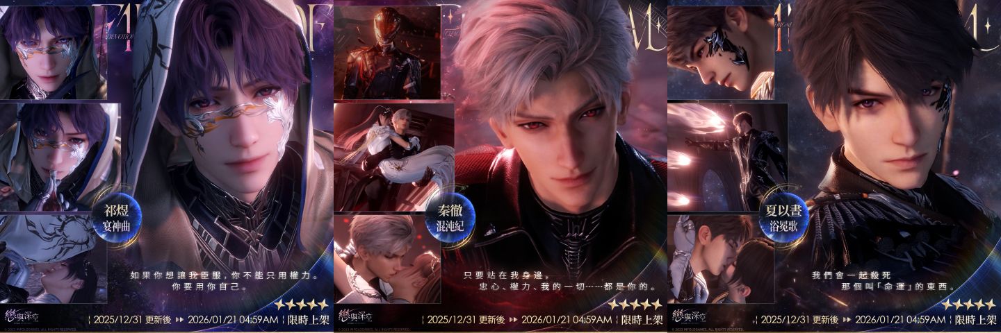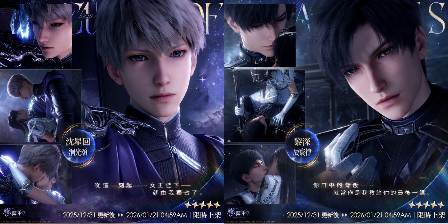 限定許願池「愛,宇宙,詩王座」開啟五星思念限時機率UP活動,獵人可從五位男主的限定五星互動思念卡「沈星回‧洄光頌」、「黎深‧辰寰律」、「祁煜‧宴神曲」、「秦徹‧混沌紀」、「夏以晝‧浴冕歌」中任選3張,所選思念許願機率限時大幅提升,占五星獲得機率的75%。活動期間,許願達到指定次數,可額外領取通用耳飾「搖曳樂章」、深空許願券‧限時×20、男主活動思念配套服飾、自選當期活動五星思念等繽紛獎勵。