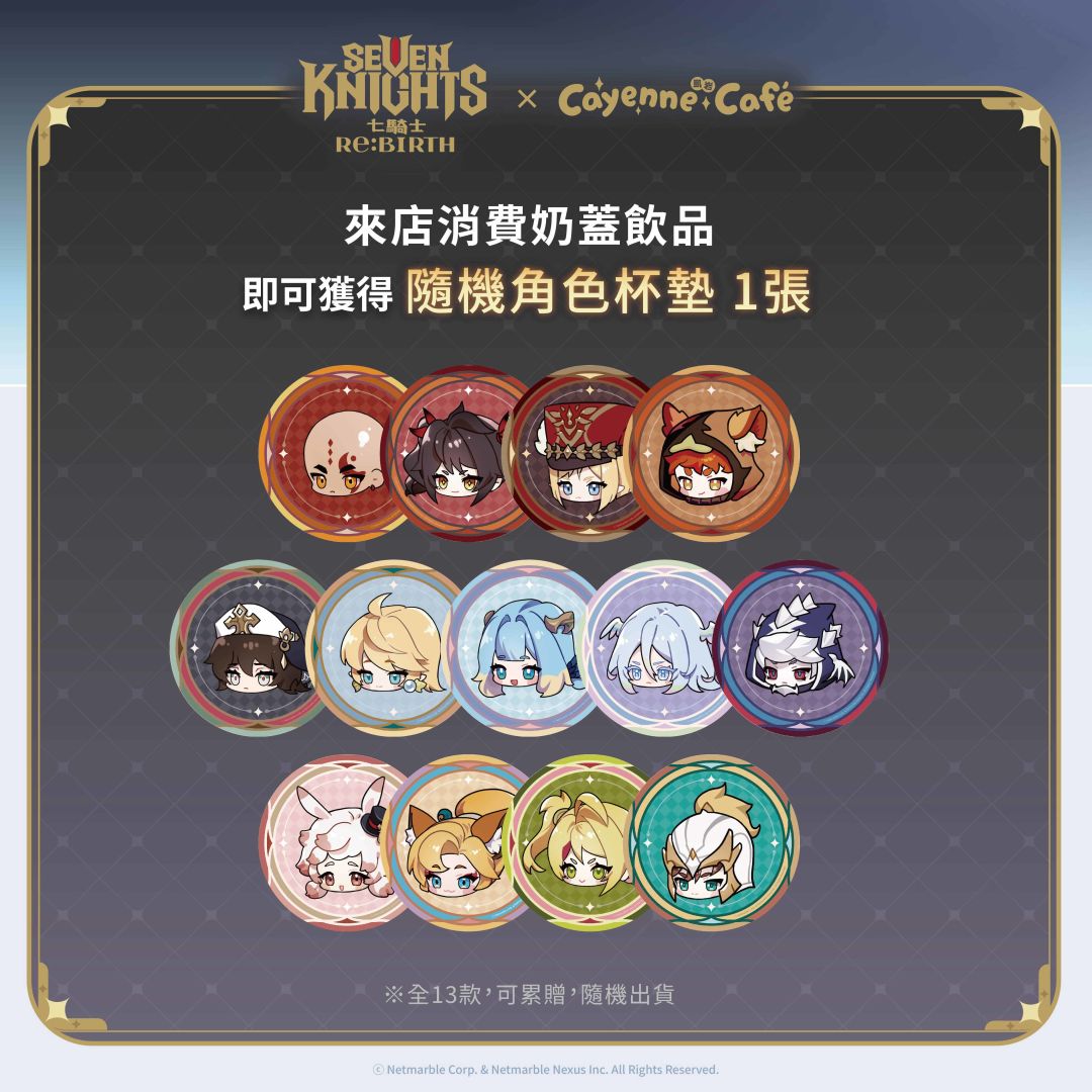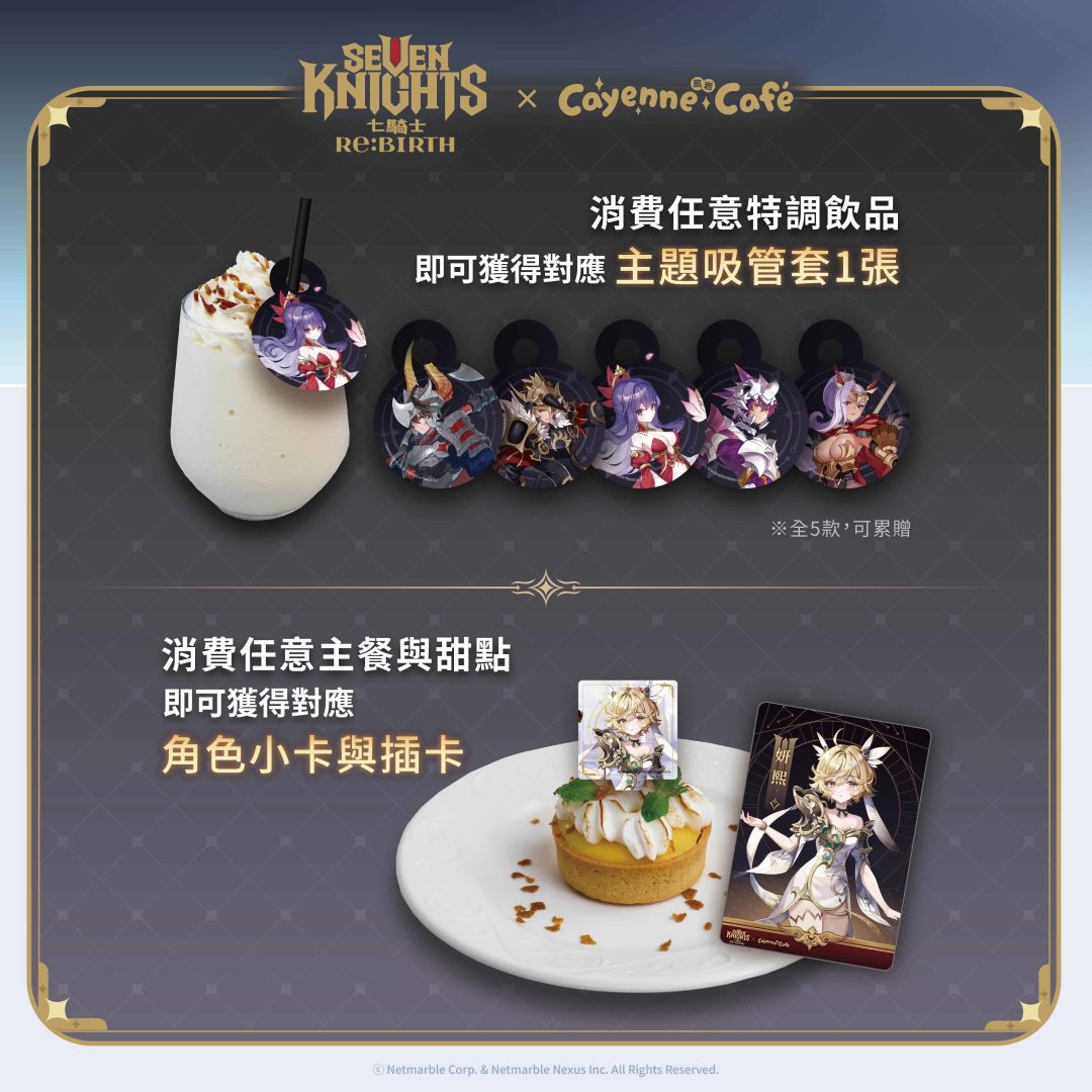本次聯名合作更推出以遊戲英雄角色為主題的多款主餐、甜點與特調飲品,將英雄特色、技能轉化為創意料理,例如象徵路迪堅定信念的黃金炊飯,以及展現雷伊潔兒火焰之力的燒烤拼盤等,讓玩家在視覺與味覺上,都能感受到英雄角色的靈魂。凡於活動期間至咖啡廳消費,即有機會獲得《七騎士 Re:BIRTH》Q 版角色杯墊、角色精美小卡、主題吸管套等周邊好禮。