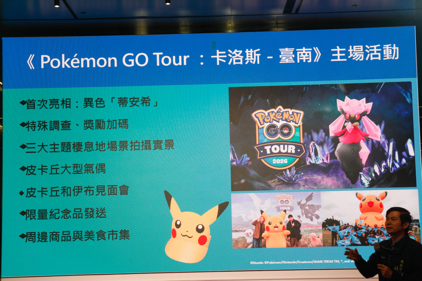 活動期間將釋出《Pokémon GO》首度登場的異色「蒂安希」。此外,配合卡洛斯地區(第六世代)主題,現場將出現「戴著卡魯穆帽子的皮卡丘」與「戴著莎莉娜帽子的皮卡丘」。實體造景部分則將由臺南都會公園現場還原三大主題棲息地「中央村莊、海洋研究所、山脈地帶」讓粉絲朝聖。