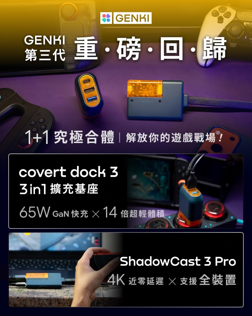本次展出的一大亮點,為 Genki 隆重迎接第三代產品的正式登場。官方指出,第三代系列不僅是規格上的升級,更代表品牌對於「極致便攜」與「強悍性能」絕不妥協的設計承諾。其中,CovertDock 3 為一款 3-in-1 65W 擴充基座,主打「口袋裡的遊戲中心」概念,機身體積較前代大幅縮小,官方表示其體積縮減達14 倍,同時仍可支援 4K 高畫質輸出,兼顧高效能與行動攜帶需求,適合需要隨時切換遊戲與工作情境的玩家。