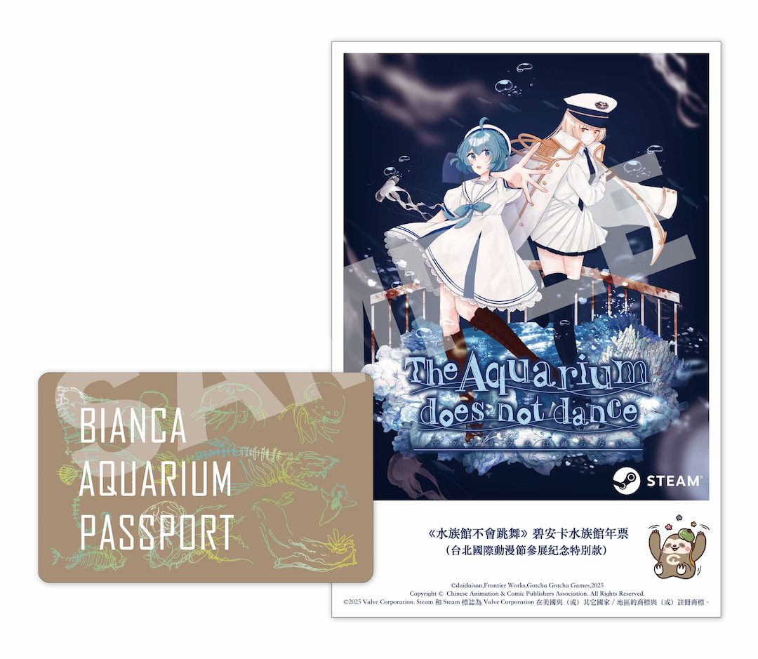 完成追蹤、領取票券風格卡片後,還可於現場再參加抽獎活動,即有機會抽中追加角色語音與全新劇情的《水族館不會跳舞》Special Edition 的 Steam 序號卡!此 Steam 序號卡是以《水族館不會跳舞》遊戲中登場的「碧安卡水族館年票」作為設計靈感,並結合「漫寶」形象所製作成的台北國際動漫節參展紀念特別款。