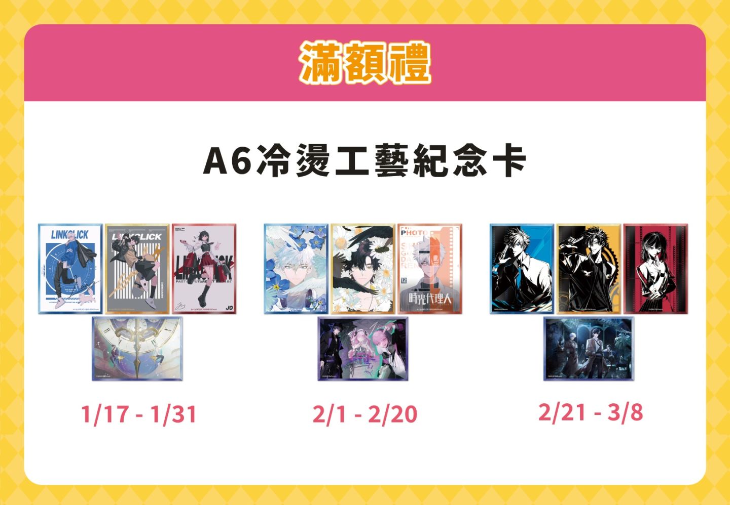 實在太多啦!「曼迪動漫狂歡祭」同場集結熱門動漫周邊,包含《名偵探柯南》、《Silent Witch 沉默魔女的秘密》、《紫羅蘭永恆花園》、《弦音-連結的一射》、《亂馬 1/2》、《死亡筆記本》、《和山田談場 Lv999 的戀愛》、《歲月流逝飯菜依舊美味》and more…,全店滿額 600 元再送《時光代理人》A6 冷燙工藝紀念卡,全 12 款隨機美圖張張精采,讓你新的一年大買大快樂!更多情報請密切注意曼迪傳播官網及粉專公告。
