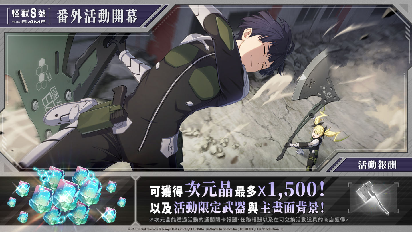 全新 ★5 保科宗四郎,於《怪獸 8號 THE GAME》揮斧登場!日本防衛隊第 3 部隊副隊長保科宗四郎,來自室町時代延續至今的怪獸討伐隊一族,是用刀的專家。對斧術有所領悟的他指導著四之宮琪歌露。究竟再次拿起斧的保科想要傳達給琪歌露的事物為何?請務必親自體驗番外活動[武器存於我心],從中體會吧!