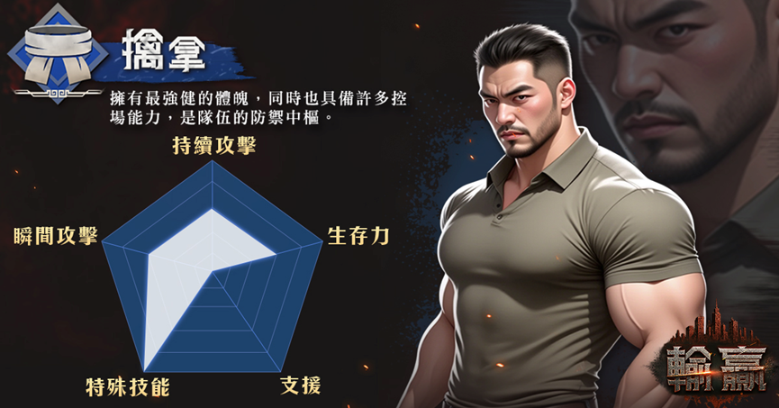 擒拿:有最強健的體魄與堅不可摧的防禦力,能在戰場上穩如磐石地守護隊友,同時擅長使用各種令敵人無法行動的限制技能,來掌控戰局節奏,是隊伍中不可或缺的防禦與控場核心。