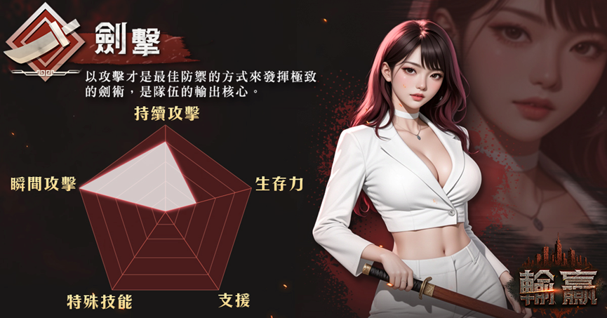 劍擊:以「攻擊即是最強防禦」為信念,擁有能在各種情況下穩定發揮的平衡戰鬥能力,運用凌厲狠辣的劍術展現壓倒性攻勢,是幫派中的頭號殺神。
