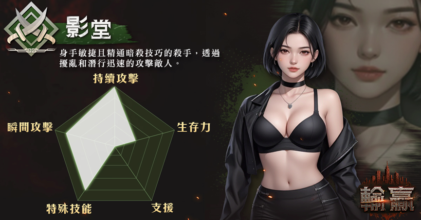 影堂:身手敏捷且精通暗殺技巧,善於利用潛行迅速接近目標,在混亂的街頭戰場中精準收割敵人性命,是令敵對幫派聞風喪膽的刺客。