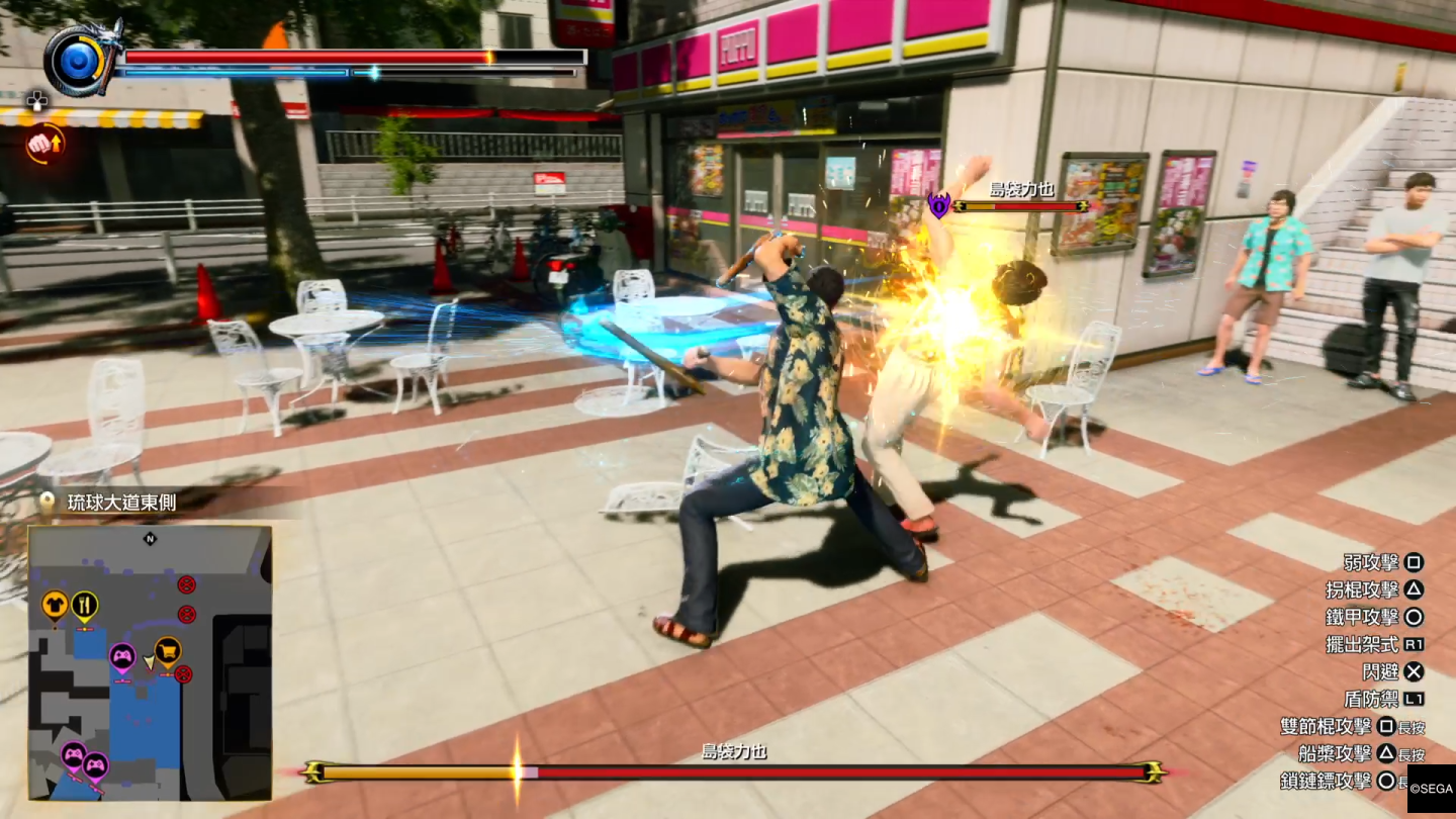 除了畫面煥然一新之外,在戰鬥手感上,《極 3》相較於原版常被詬病的「敵人頻繁防禦」,新版導入手感類似《8 外傳》的風格動作手感,特別是主角桐生一馬新增的「琉球風格」展現八大以沖繩為靈感的特色武器,不僅有不同的攻擊軌跡與判定連段,更具有格擋機制甚至能彈開並發動反擊。