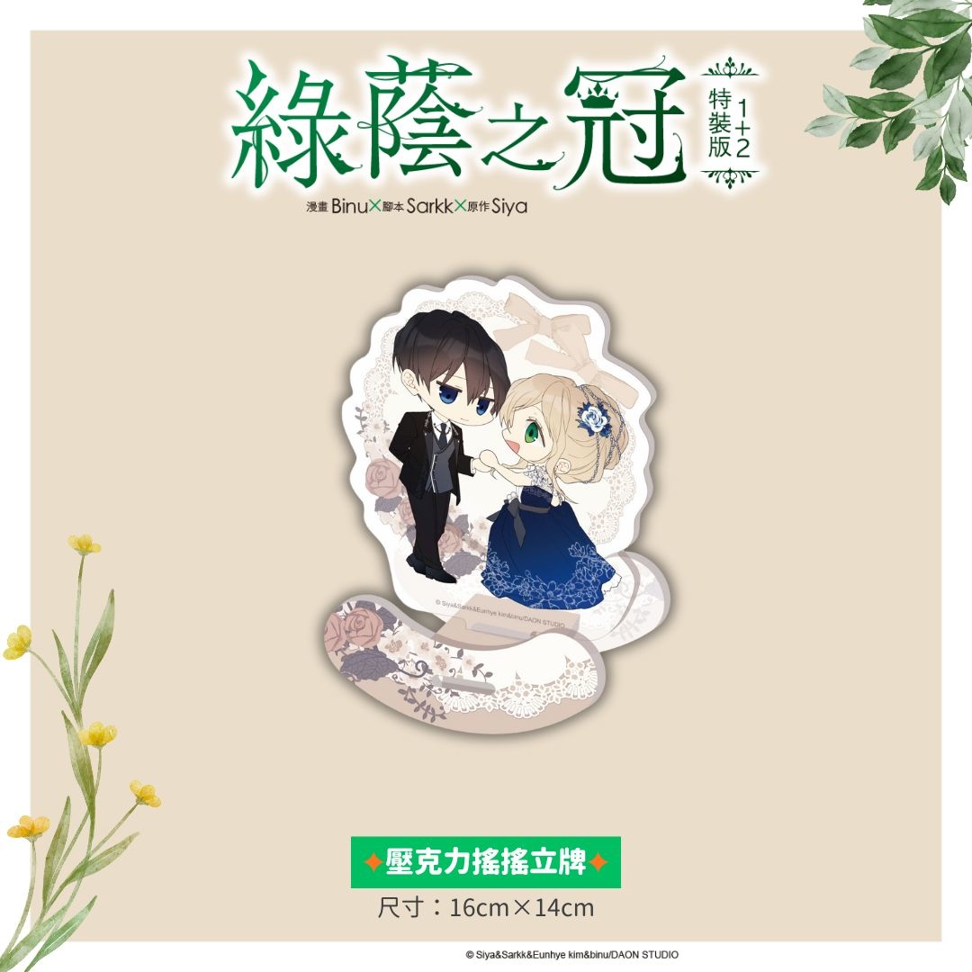 《綠蔭之冠【1+2特裝版】》本次收錄多款精美限定周邊。除了「單行本 1+2 集(皆含首刷限定精美小卡)」,還有以 Q 版角色形象為主題設計的「壓克力搖搖立牌」,以及將精美插畫融入實用場景的「多功能防塵滑鼠墊」和極具收藏價值的「銀箔海報組」;另外還有「可愛人生四格+情緒人生四格」透過趣味四格描繪蘭不同的一面,為緊張的主線劇情增添輕鬆可愛的日常風貌。此外,《綠蔭之冠》也同步推出電子書版本,並附上電子書限定數位書卡,偏好數位閱讀的讀者千萬別錯過,將《綠蔭之冠》的精彩篇章一次收入囊中。
