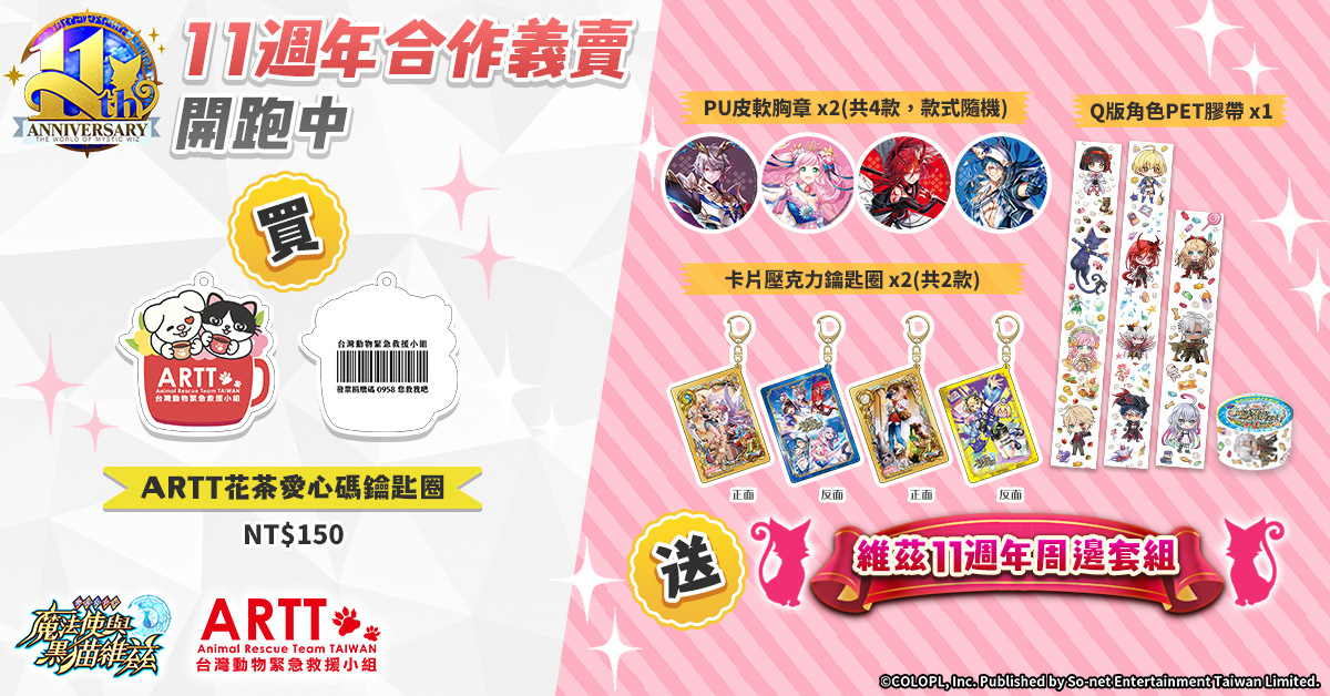 1/14 起,凡至指定網站購買《台灣動物緊急救援小組》「ARTT 花茶愛心碼鑰匙圈」,即贈送「黑貓維茲」11 週年週邊套組!套組包含PU 皮軟胸章 x2(共 4 款,款式隨機)、【暖心救援】卡片壓克力鑰匙圈 x2(共 2 款),以及 Q 版角色 PET 膠帶 x1,獎勵週邊數量有限,贈完為止!魔法師們千萬別錯過!