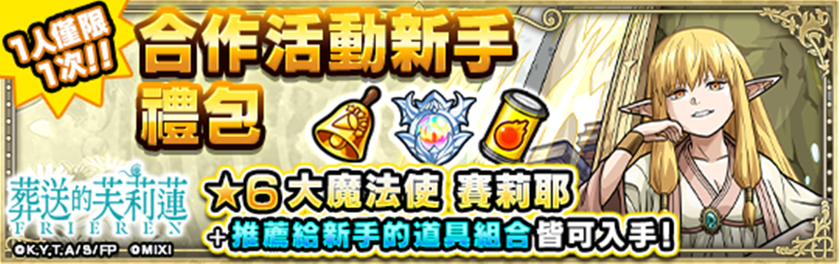 購買「動畫《葬送的芙莉蓮》第 2 彈合作活動新手禮包」,就能以運氣5&等級「極」&「+值」MAX狀態獲得「大魔法使賽莉耶(★6)」。此外,還能獲得任選鈴及體力罐等推薦給新手的道具組合!「大魔法使賽莉耶」只能透過合作活動新手禮包入手,每人限購 1 次!