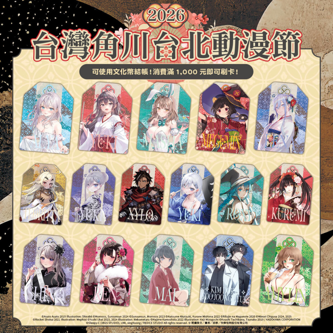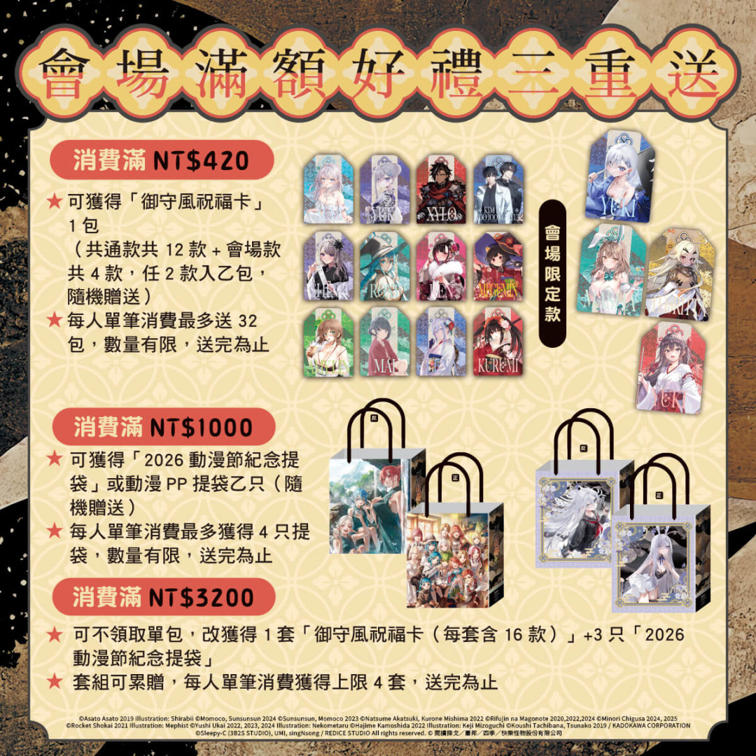 展場活動期間,全館消費滿NT$420:贈送和風雅致的「御守風祝福卡」乙包(內含隨機2款),收錄作品人物包括《不時輕聲地以俄語遮羞的鄰座艾莉同學》艾莉、《靠死亡遊戲混飯吃。》浴衣幽鬼、《判處勇者刑 懲罰勇者9004隊刑務紀錄》賽羅、《全知讀者視角》金獨子&劉衆赫、《志乃與戀》志乃&戀、《無職轉生~到了異世界就拿出真本事~》洛琪希、《為美好的世界獻上祝福!》惠惠、《臺灣戀愛物語⁵》林姿婷、《青春豬頭少年系列》麻衣、《86─不存在的戰區─》蕾娜、《約會大作戰DATE A LIVE》狂三;「會場限定款」則為《不時輕聲地以俄語遮羞的鄰座艾莉同學》瑪夏&有希、《靠死亡遊戲混飯吃。》暴走族幽鬼、《判處勇者刑 懲罰勇者9004隊刑務紀錄》女神泰奧莉塔,共計十六款。此外,消費滿NT$1,000贈「2026動漫節紀念提袋」或動漫pp提袋乙只,款式分別為「無職轉生款」及「靠死亡遊戲混飯吃。款」;消費滿NT$3,200可改獲得1套「御守風祝福卡(每套含16款)」+3只「2026動漫節紀念提袋」。