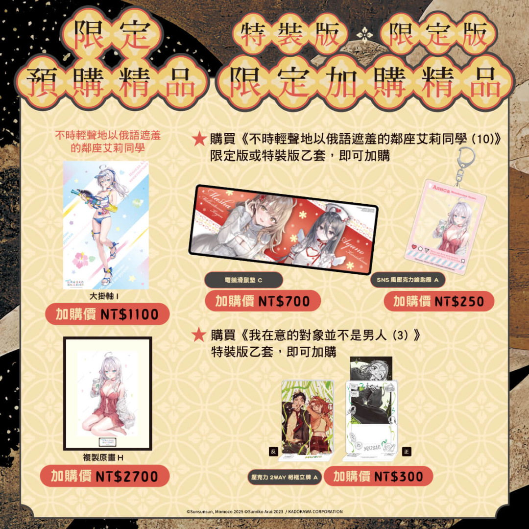 於會場購買《不時輕聲地以俄語遮羞的鄰座艾莉同學 (10)》限定版or特裝版即可加購電競滑鼠墊 與SNS風壓克力鑰匙圈;購買《我在意的對象並不是男人 (3)》特裝版即可加購壓克力2WAY相框立牌。除此之外,還推出會場&官網預購限定的《不時輕聲地以俄語遮羞的鄰座艾莉同學》「大掛軸」大尺寸設計氣勢十足,無論掛在何處都能展現極強的存在感;以及極具紀念意義的「複製原畫」,每一幅皆附有獨一無二的專屬流水號,讓這份逸品更顯珍貴。