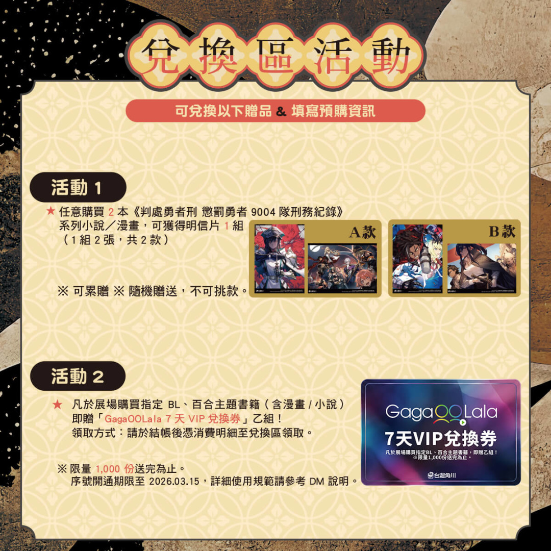 凡於展場購買指定 BL、百合主題書籍(含漫畫/小說),即贈「GagaOOLala 7天VIP兌換券」乙組!