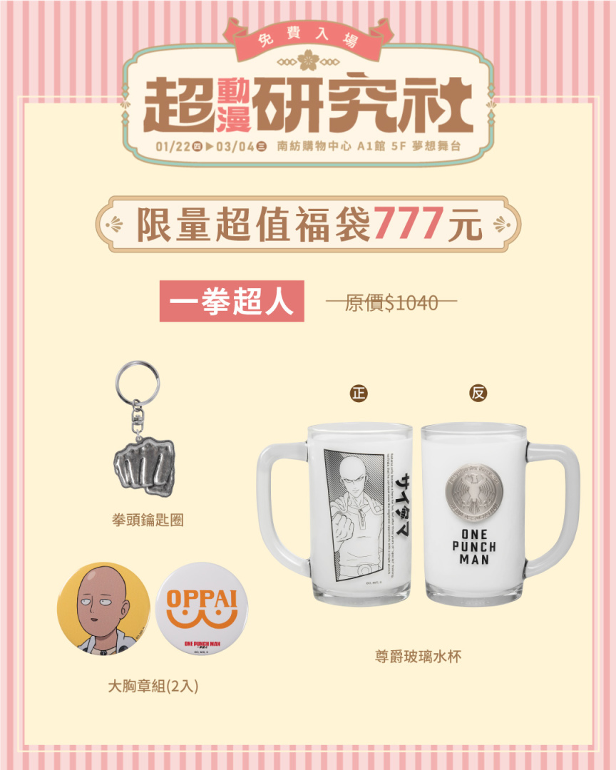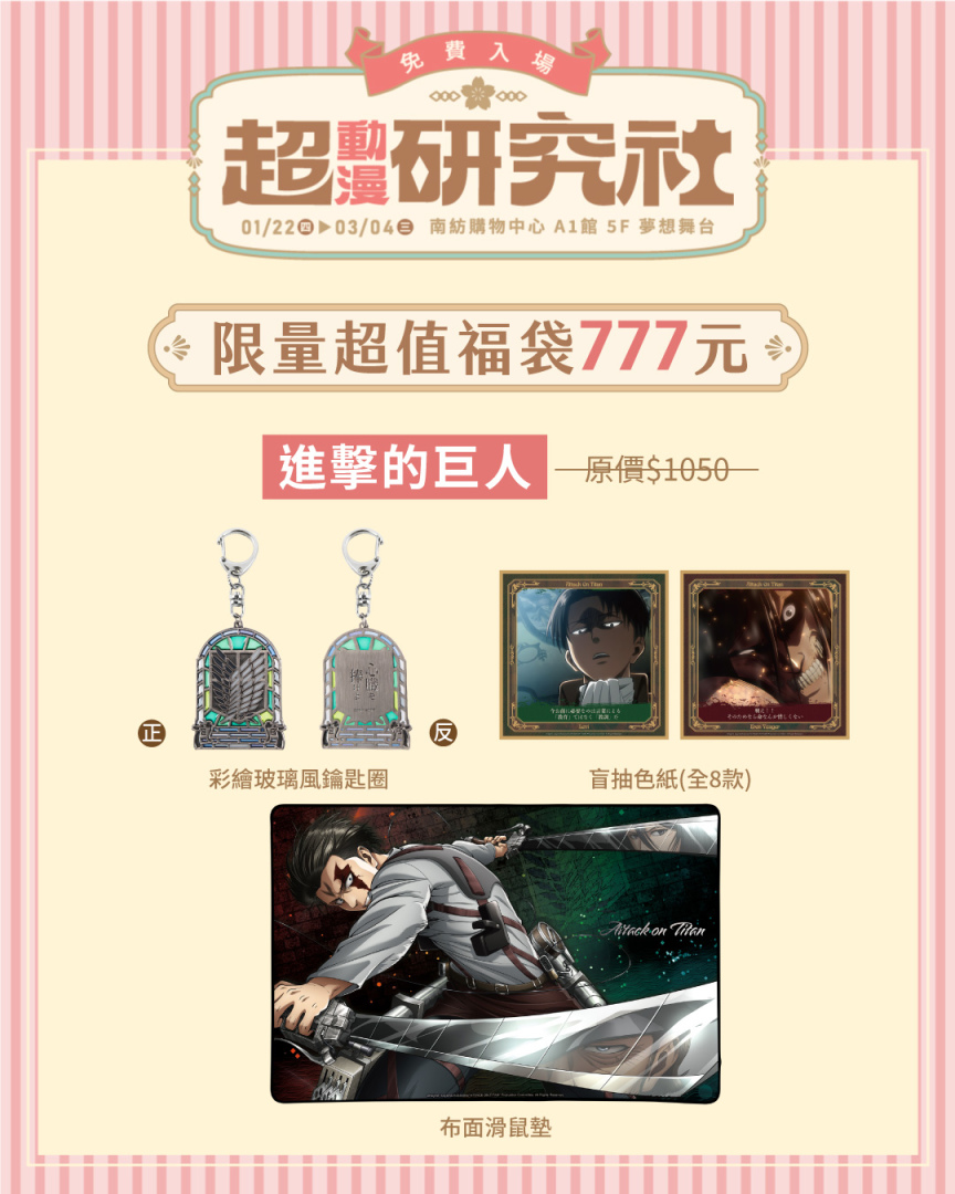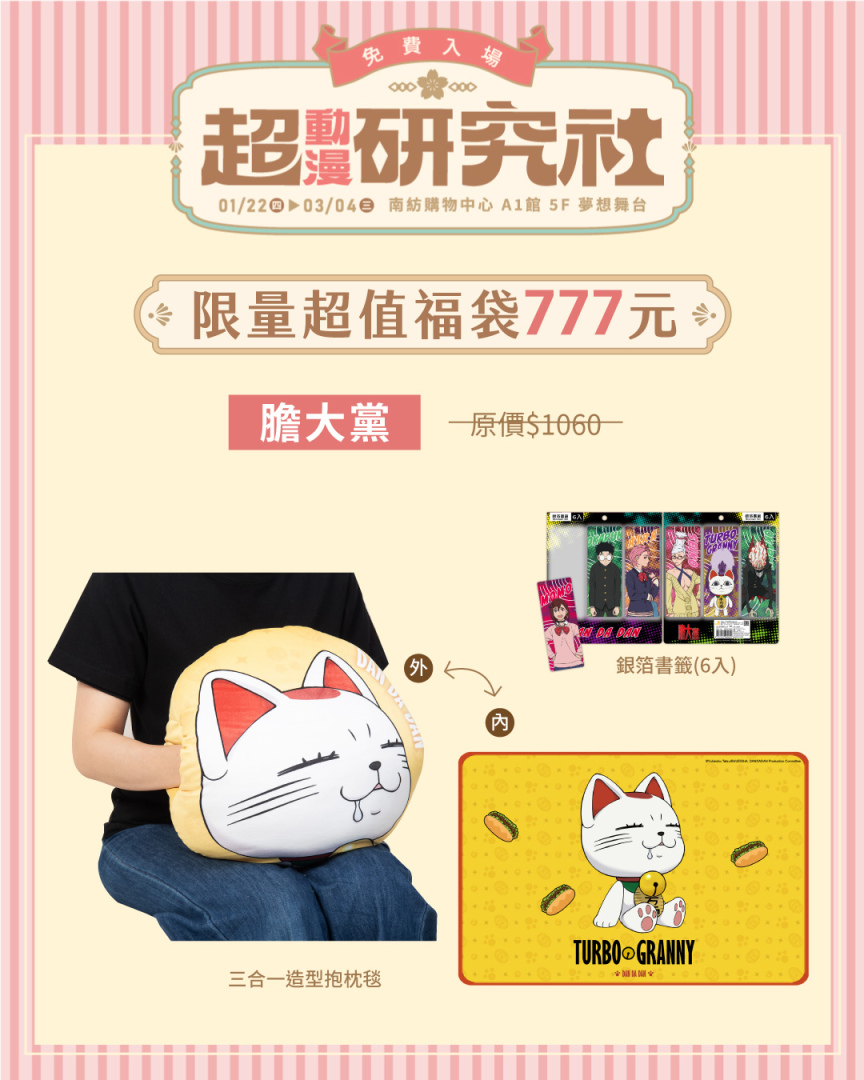 「超動漫研究社」帶來了六款限量福袋,每款售價 777 元,內含多款實用周邊與收藏商品,內容豐富、驚喜滿滿,動漫迷千萬不可錯過。《葬送的芙莉蓮》福袋包含了鑽底霧杯組、造型抱枕,以及盲抽炫彩大胸章,將作品溫柔氛圍融入日常生活。《獵人 HUNTER×HUNTER》福袋內含奇犽方形抱枕、嘟嘟馬克杯與銀箔書籤組,《進擊的巨人》福袋則帶來大尺寸里維布面滑鼠墊、調查兵團彩繪玻璃風鑰匙圈,以及盲抽色紙。《膽大黨》福袋主打三合一造型抱枕毯,搭配銀箔書籤組,可愛與實用度一次到位。《鬼滅之刃》福袋收錄壓克力墜飾立牌組、鎹鴉矽膠零錢包,以及盲抽大胸章。《一拳超人》福袋則包含尊爵玻璃水杯、立體拳頭鑰匙圈與大胸章組,簡潔有力的設計風格,完美展現作品特色。