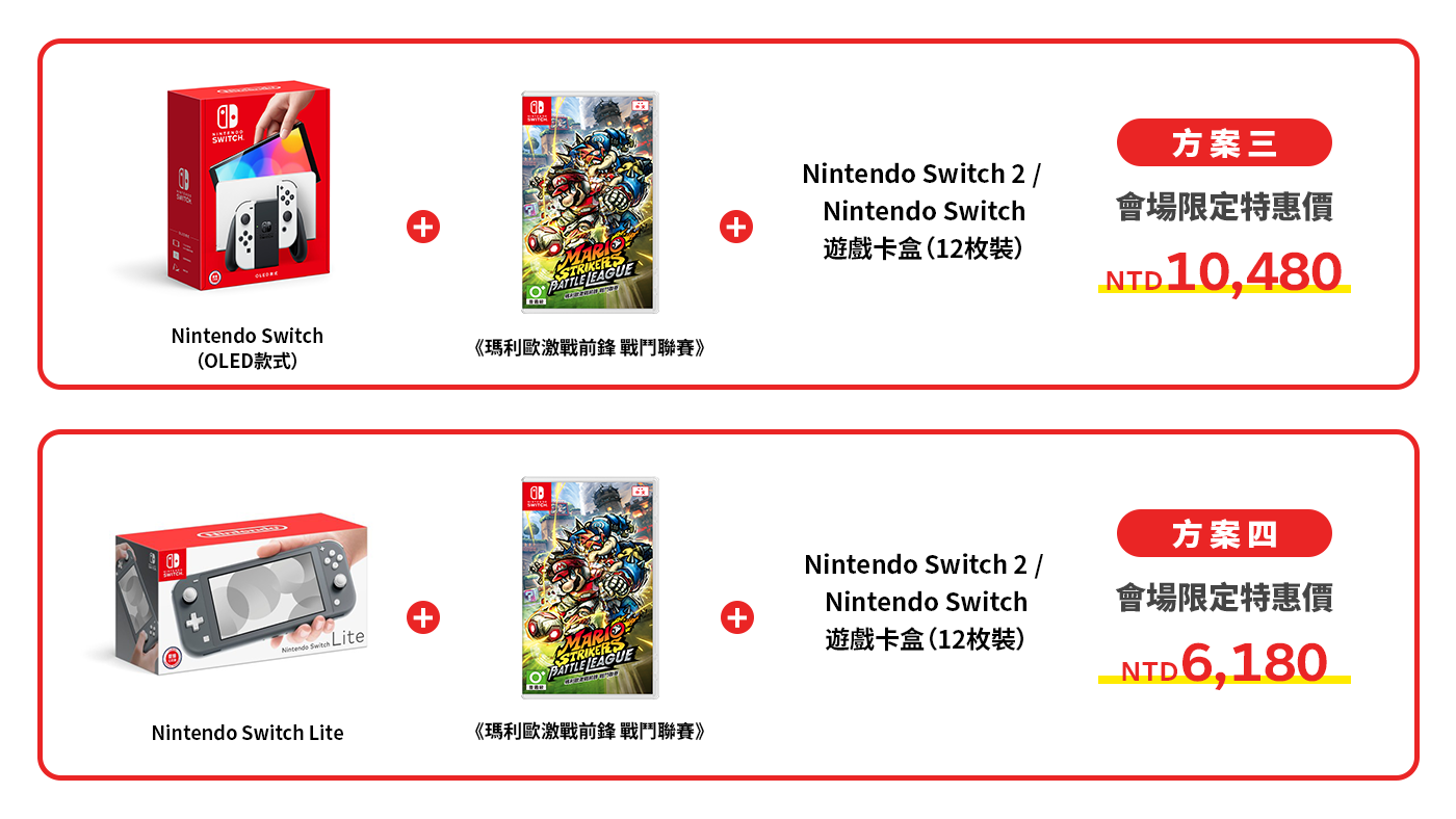 內容:Switch Lite 主機、《瑪利歐激戰前鋒 戰鬥聯賽》、12 入遊戲卡盒。