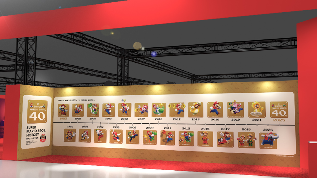 超級瑪利歐兄弟40週年歷史牆:Family Computer專用軟體《超級瑪利歐兄弟》,喜迎在日本發售40週年,本次會場將設置描繪了各代瑪利歐的「超級瑪利歐兄弟40週年歷史牆」下載供智慧型手機使用的應用程式《Nintendo Today!》,透過相機讀取牆面上各代瑪利歐的插畫,就能在遊戲場景與音樂伴隨之下,閱覽《超級瑪利歐兄弟》系列的歷史。